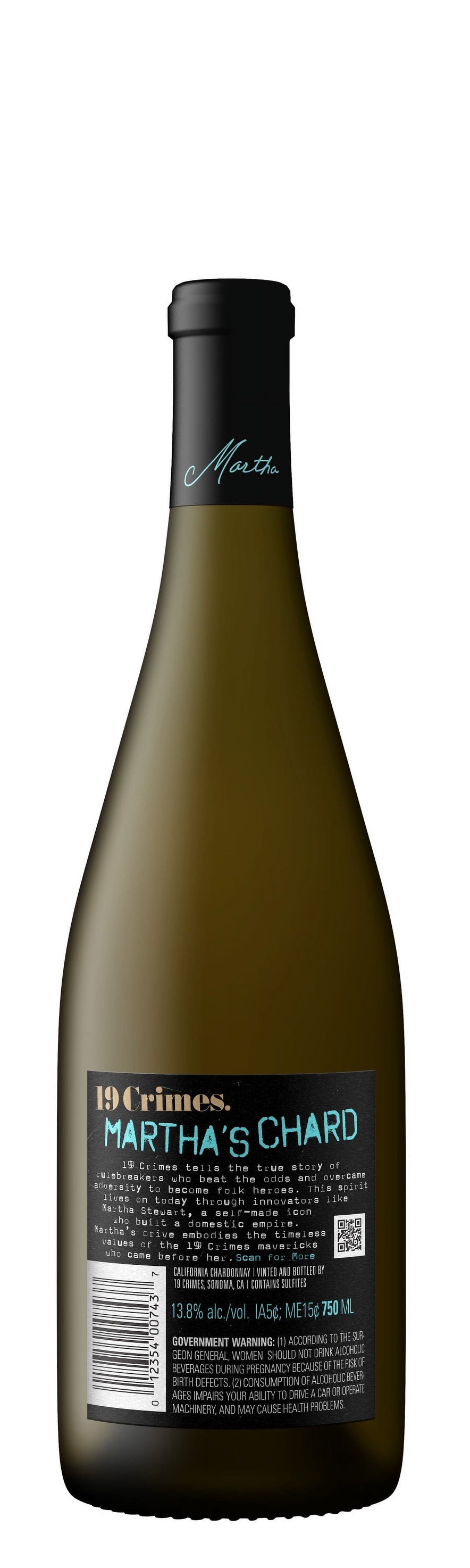 19 Crimes tells the true story of rulebreakers who beat the odds and overcame adversity to become folk heroes. This spirit lives on today through innovators like Martha Stewart, a self-made icon who built a domestic empire. Martha's drive embodies the timeless values of the 19 Crimes mavericks who came before her. 19 Crimes Martha’s Chard is a crisp California Chardonnay white wine with stone fruit notes. Mid-palate, its toasty sur-lies character married with creamy, caramel oak emerges. A firm, acidic core keeps savory notes from dominating the fruit, and offers up a crisp, refreshing finish. This 750 ML Chardonnay is best enjoyed with plenty of wine glasses to share.