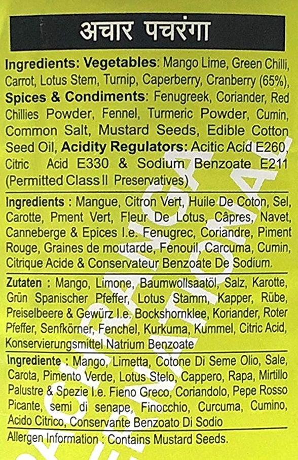 The mouth-watering Pachranga Achar Pachranga Mixed Pickle is made from mango, lime, carrot, green chilly, ginger, gooseberry, fruit and many other tasty ingredients.