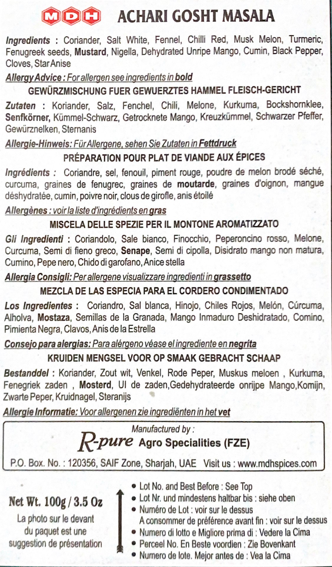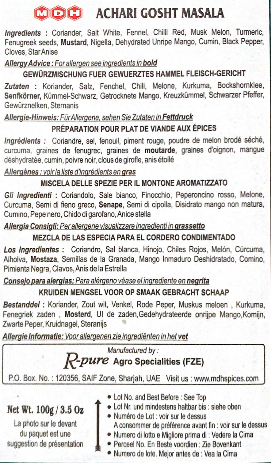 Enjoy the authentic flavors of MDH Achari Gosht seasoning. It's a simple way to bring the classic dish into your kitchen, even if you're not an expert chef. Just add goat, mutton or your favorite meat and a few other ingredients along with the MDH seasoning mix to create a flavorful experience that transports you to northern India, no matter where you may live. It's ready with only four easy steps. Serve the finished tasty entree with naan or roti to complete your meal in traditional style. MDH Achari Gosht. Just add meat and a few other ingredients