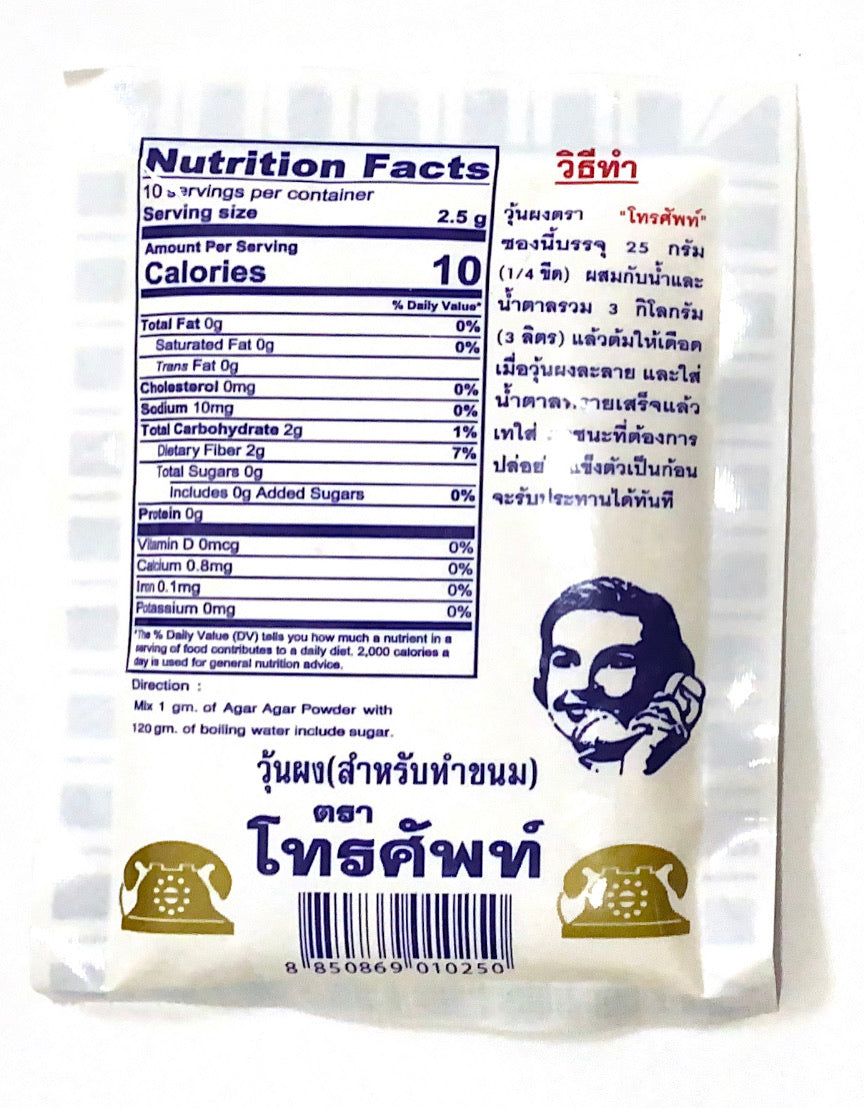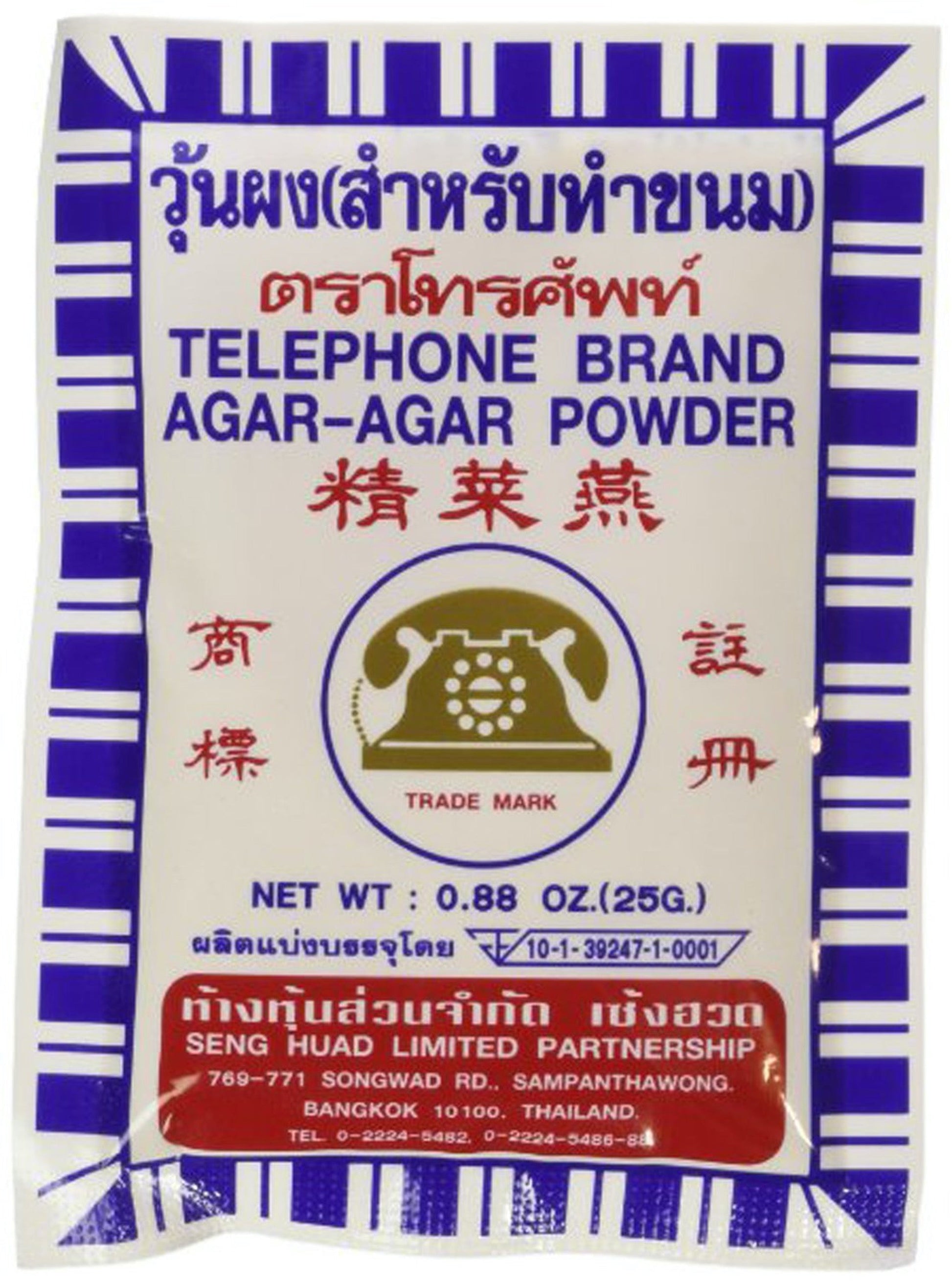 Telephone Brand Agar-Agar Powder 25g is a red algae and an unique vegetable source protein. Agar has been used in the Far East for centuries and is referred to as Agar-Agar. Can be used to make a gelatin with water or fruit juice.