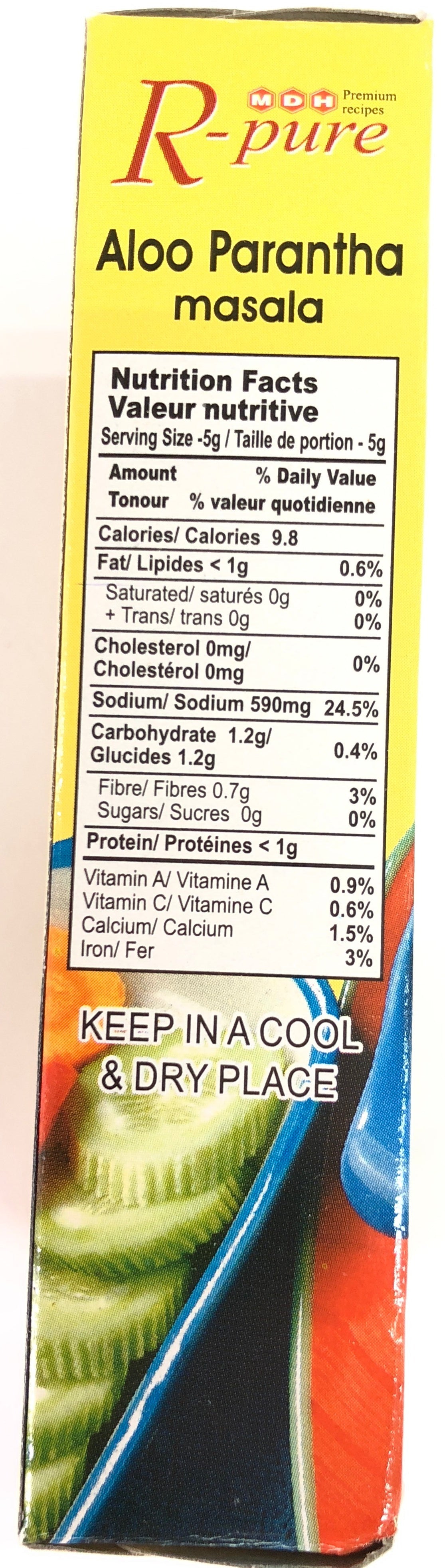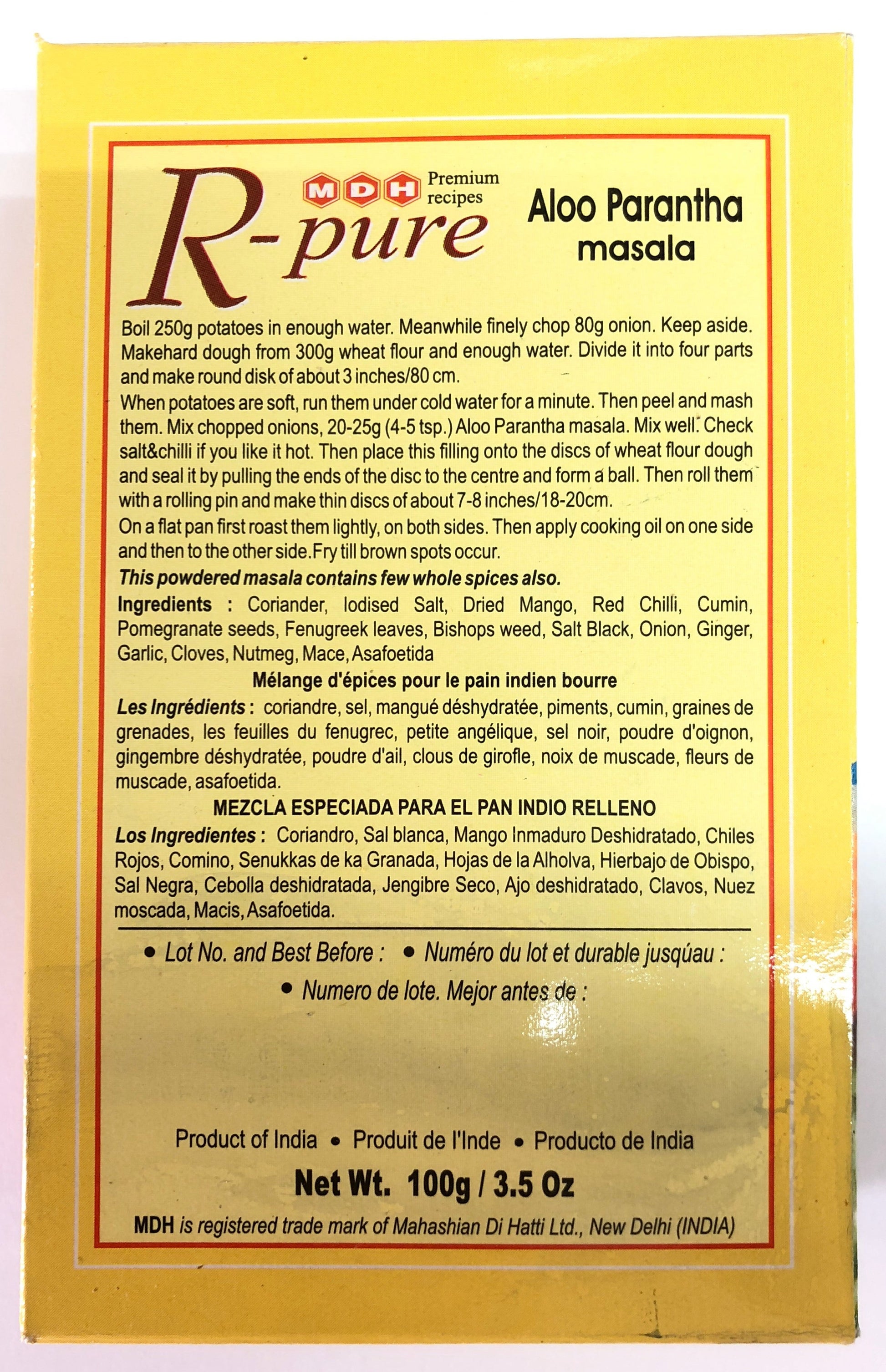 The MDH R-Pure Aloo Paratha is a stuffed roll filled with aloo and a tantalizing mixture of spices. It is an Indian chapatti filled with potatoes that can be eaten as a savory snack, either in morning or evening. This masala enhances the taste of North India’s favorite Aloo Paratha.
