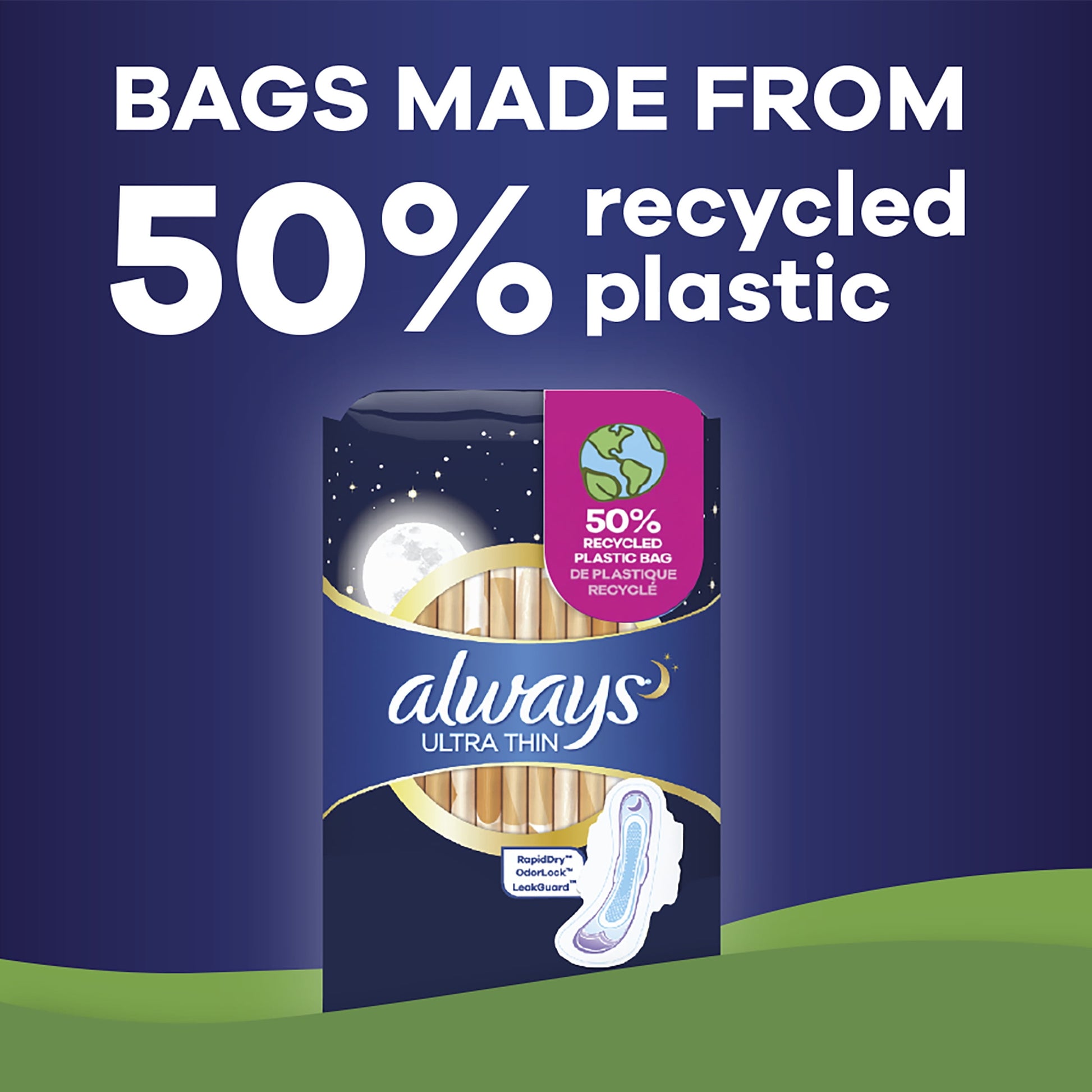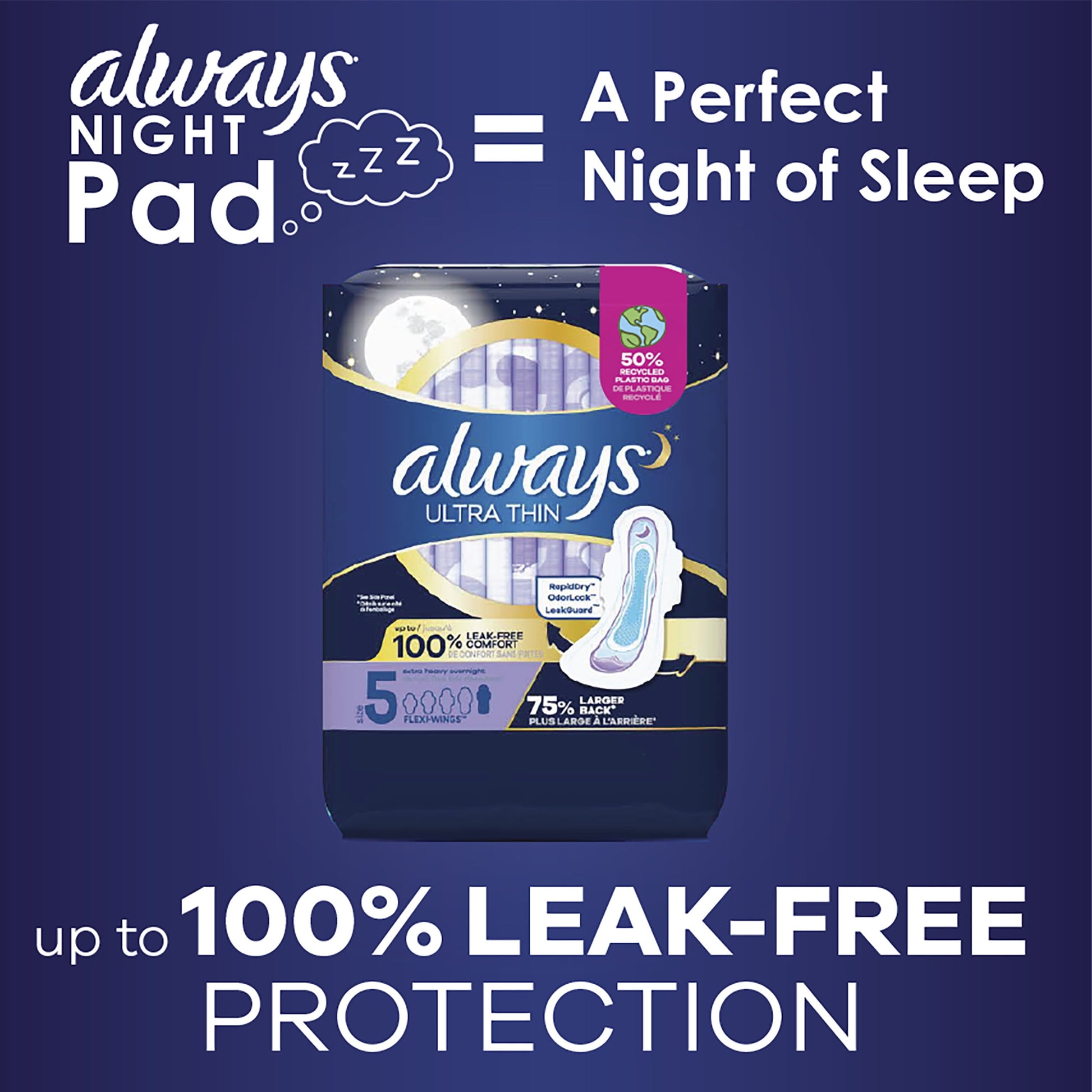 Think all feminine hygiene pads are the same? Think again! Always Ultra Thin Extra Heavy Overnight Pads with Flexi-Wings are our best yet, providing people with periods up to 100% Leak-Free Comfort. Always Ultra Thin Overnight Pads with Wings, Size 5, Extra Heavy Overnight Absorbency, 46 CT have a flexible sanitary pad design that moves with you. Plus, Ultra Thin Pads have Always 3x Protection System™ to give you peace of mind day and night. RapidDRY™ absorbs gushes 90% faster than the leading store brand. The LeakGUARD™ core locks in leaks for long-lasting protection. Plus, OdorLOCK™ helps prevent unwanted odors to help you feel fresh and clean throughout your day! Did you know that 50% of people with periods are wearing the wrong size pad? Don’t sacrifice your sleep during your period, instead, wear a larger size pad at night to catch your period flow when you are laying down. Always Ultra Thin Extra Heavy Overnight Pads have 75% more back coverage than our size 1 pad, so you can rest easy. All our Ultra Thin feminine hygiene pads have our 3x Protection System™ and come in a range of period pad sizes from 1 to 5 to fit your flow and size perfectly. If you have a light flow or need a teen-sized pad, then we would recommend using our Always Ultra Thin size 1 to 3. If you have a heavy flow or want overnight protection, then use our size 4 or 5 Ultra Thin Pad. Always Ultra Thin has you protected day and night from your first period to your last. Remember that all Always Ultra Thin Pads are FSA eligible! Check with your FSA or HSA plan provider for information on the coverage of period care products.