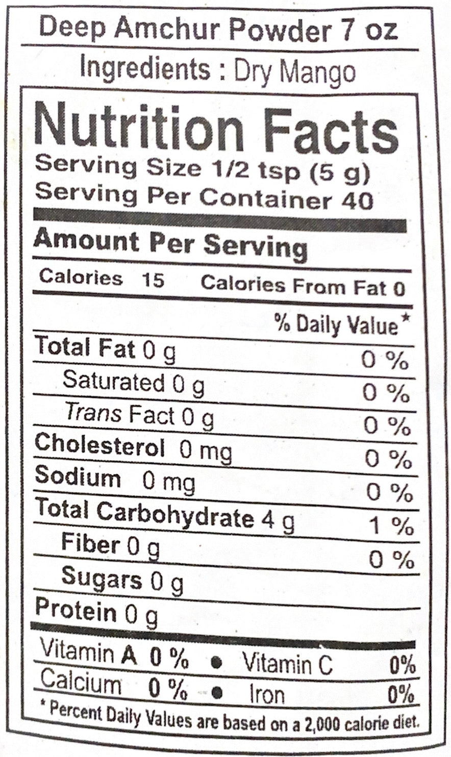 Deep Amchur Powder is a fruity spice powder made from dried unripe green mangoes and is used as a citrusy seasoning. It is used to flavor foods and add the nutritional benefits of mangoes when the fresh fruit is out of season. It is used in stir fried vegetable dishes, soups, curries, and to tenderize meat and poultry.