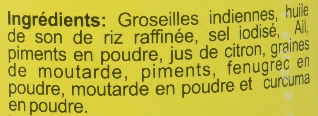 • Contains: Amla Berries, Refined Rice Bran Oil, Iodized Salt, Tamarind Extract, Mixed Spices, Lime Juice, Mustard Seeds, Dry Chillies, Curry Leaves and Asafoetida.