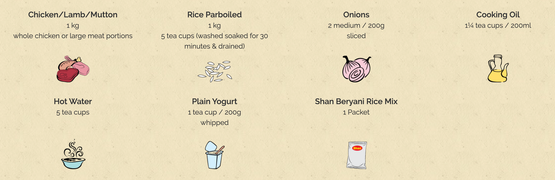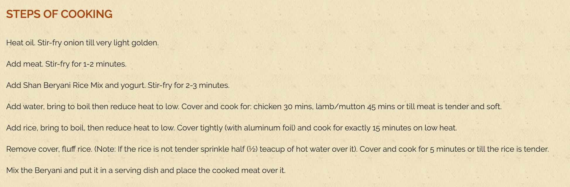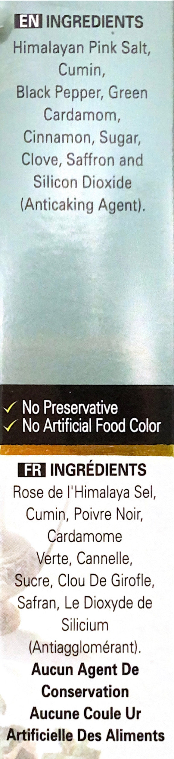 Arabic mild meat pilaf. Can be used with chicken/lamb/mutton. Also required for this recipe is rice, onions, butter/oil, hot water and yogurt. Recipe provided on box. Ingredients: himalayan pink salt, cumin, black pepper, green cardamom, cinnamon, sugar, clove, saffron and silicon dioxide.