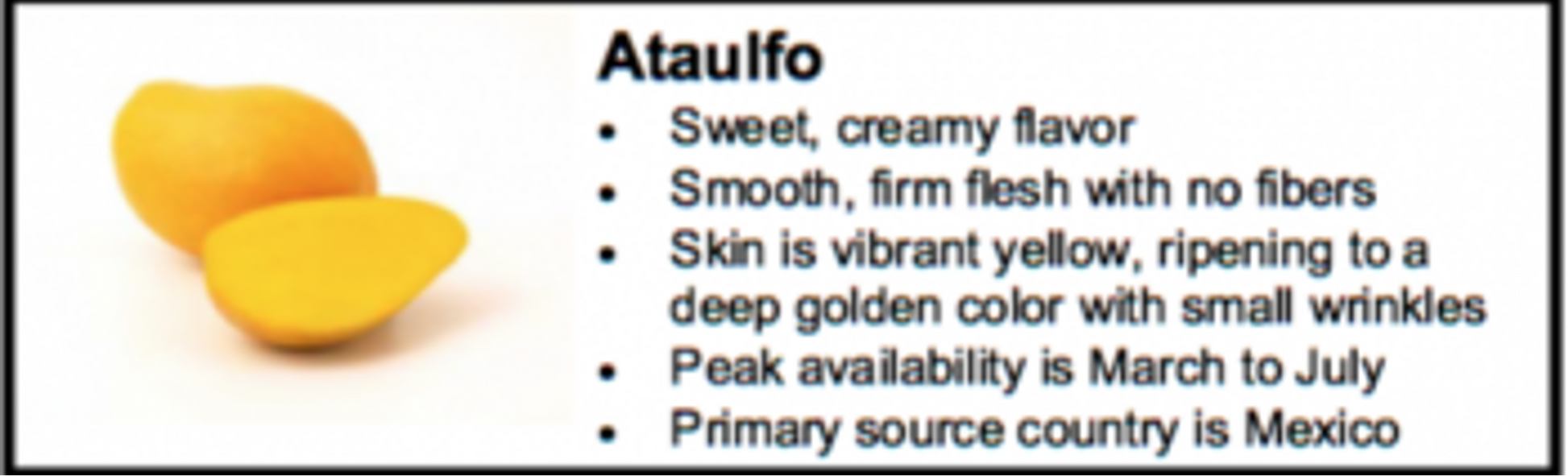 Ataulfo mangoes are oval-shaped and slightly crook-necked with a golden yellow exterior and bright yellow flesh. Smaller in size and less fibrous than a traditional mango, the skin of the Ataulfo mango is tough and the flesh is soft, sweet and juicy. When ripe and at room temperature the Ataulfo mango will have a sweet smell and a slight wrinkling of the skin.