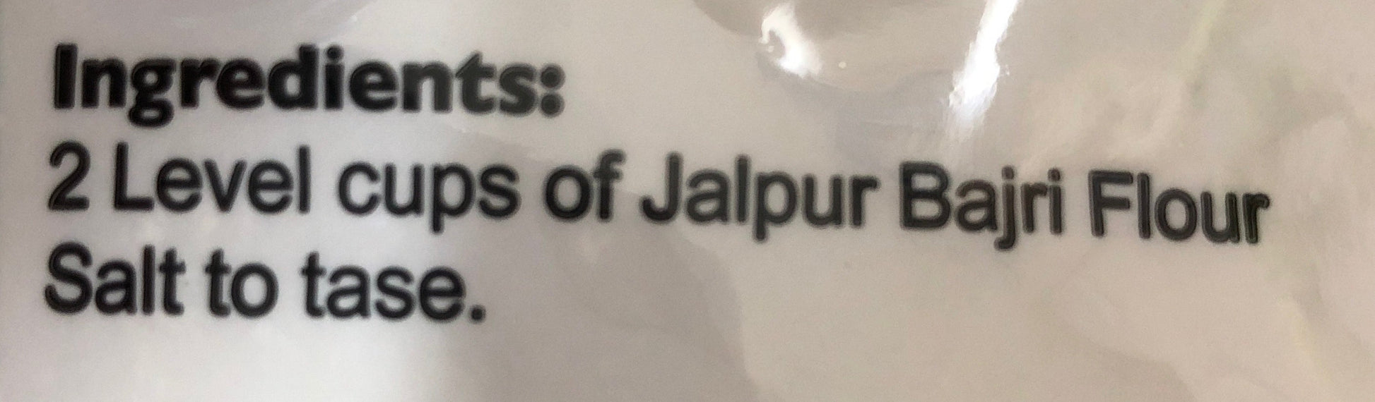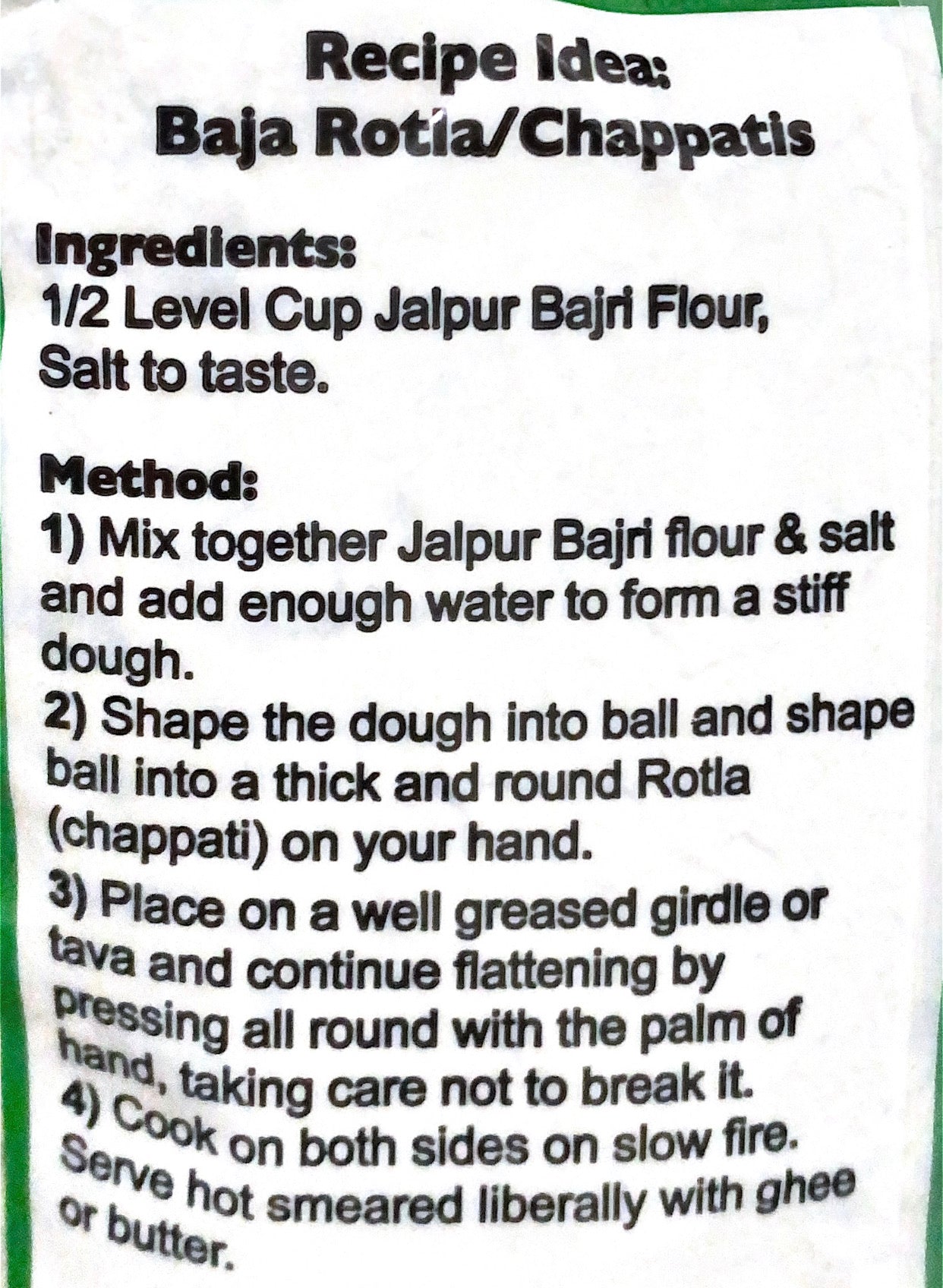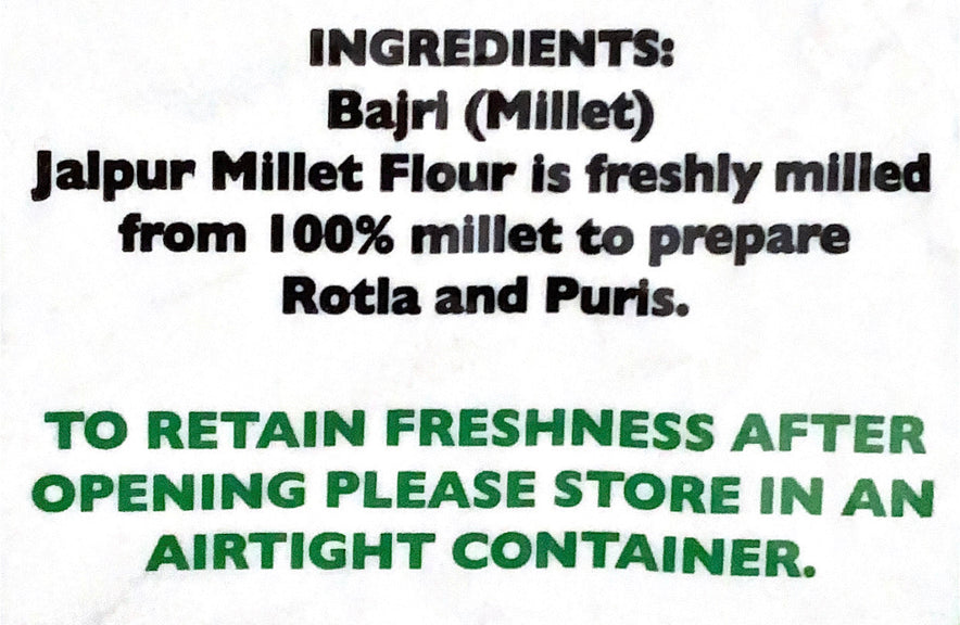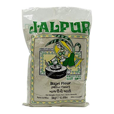 Jalpur Bajri Flour is a popular South Indian atta (flour) that is used to make Puttu (South Indian style steamed rice cake). This greyish flour is made from millet, also known as bairi in North India and ragi in the South. It has a particular nutty aroma and a slight bittersweet after taste. It is commonly used to make breads with mixed with atta. Bajri flour also has higher nutrition value than rice and oats. Jalput Millet Flour is freshly milled from 100% millet to prepare rotla and puris. How to make Baja Rotla / Chappatis: 2 level cups of Jalpur Bajri Flour and salt to taste. Method: 1. Mix together Jalpur Bajri Flour and salt and add enough water to form a stiff dough. 2. Divid the dough into lime - sized balls and shape each ball into a thick and round rotla (chappati) on your hand. 3. Place on a well greased girdle or tava and continue flattening by pressing all round with the palm of hand, taking care not to break it. 4. Cook on both sides on slow fire. Serve hot smeared liberally with ghee or butter.
