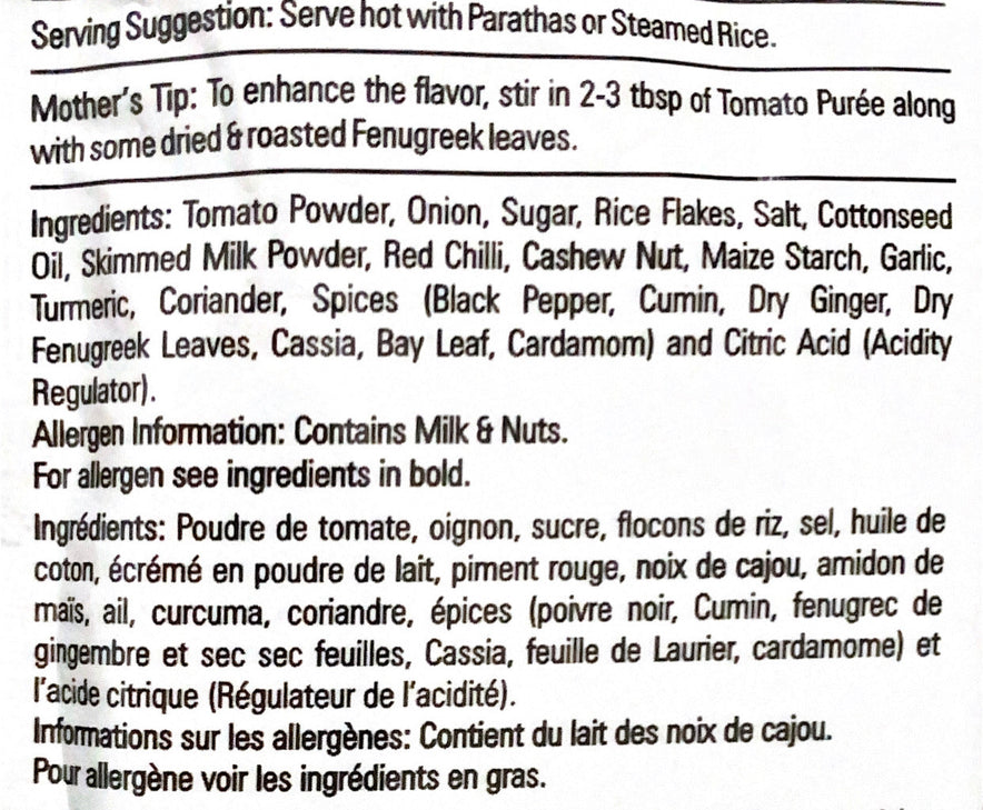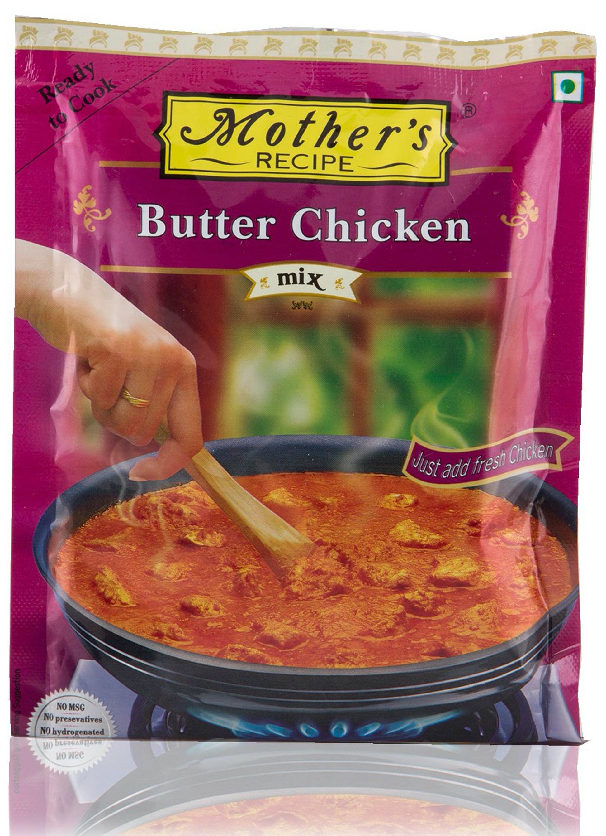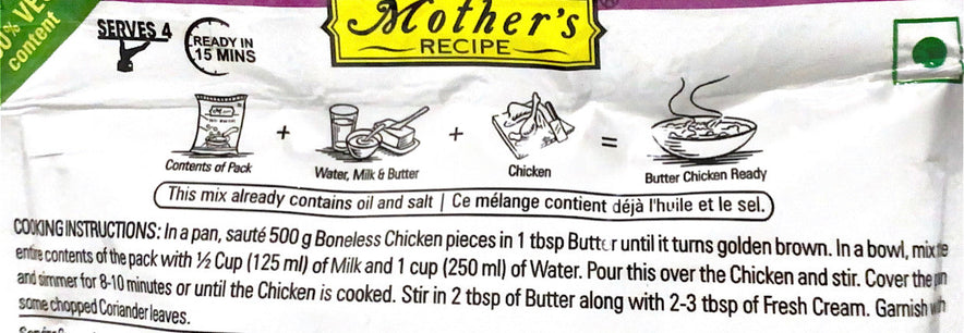 How to make-  In a pan, saute 300g boneless chicken in 1 tbsp of butter until they turn golden brown. In a bowl mix the entire content of Butter chicken mix with 125ml milk & 250 ml of water. Pour this over chicken & stir. Cover the pan & simmer for 8-10 minutes till the chicken is cooked. Sitr in 2 tbsp of butter & serve