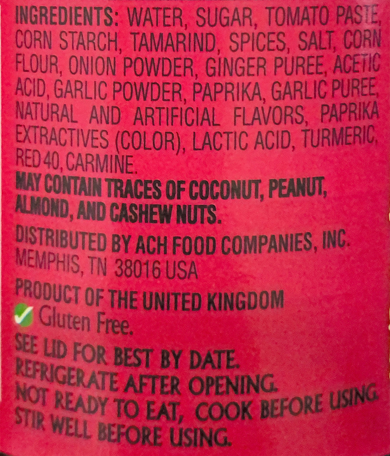 'WATER, SUGAR, TOMATO PASTE, CORN STARCH, TAMARIND, SPICES, SALT, CORN FLOUR, ONION POWDER, GINGER PUREE, ACETIC ACID, GARLIC POWDER, PAPRIKA, GARLIC PUREE, NATURAL AND ARTIFICIAL FLAVORS, PAPRIKA EXTRACTIVES (COLOR), LACTIC ACID, TURMERIC, RED 40, CARMINE.'