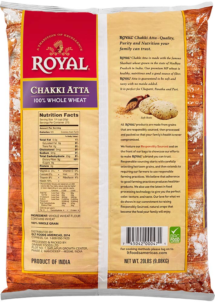 This Royal Chakki Atta 100% whole wheat flour is perfect for a variety of specialty breads. Use it to make authentic, traditional, Indian-style breads like roti, chapati, and naan. It creates a soft dough when baked, so it's an excellent choice for baking dinner rolls and breads at any establishment. This flour produces wholesome breads with a brown crumb color. Made from responsibly sourced whole wheat and vital wheat gluten, this flour is high in fiber, vitamin-rich, and features all the nutritional benefits of whole grains. Vital wheat gluten is a natural source of protein that provides strength in dough, reduces breakage, and allows your foods to hold their shape well. Stock your bakery or restaurant with this bulk supply of flour and bake a variety of whole wheat rolls and breads!