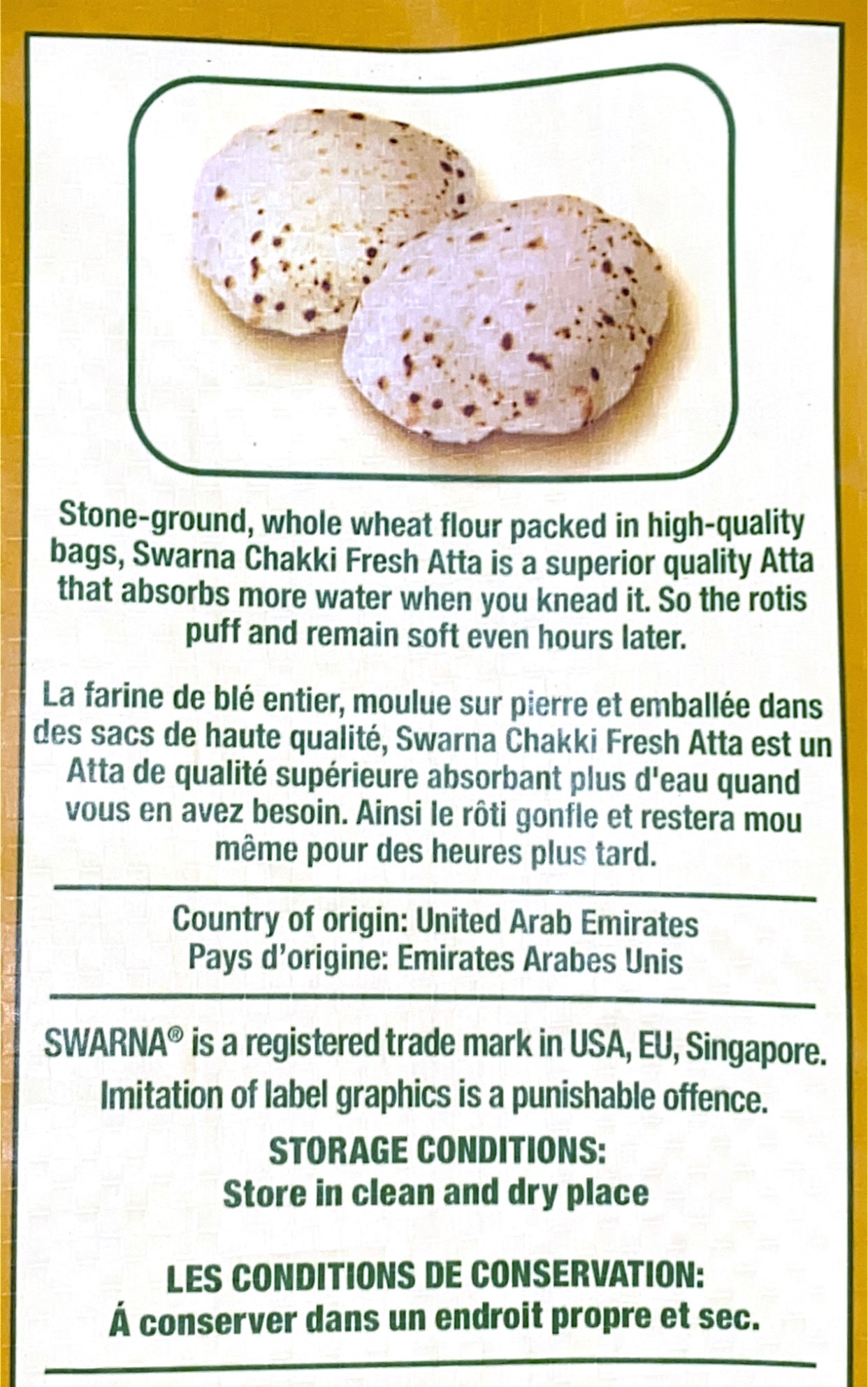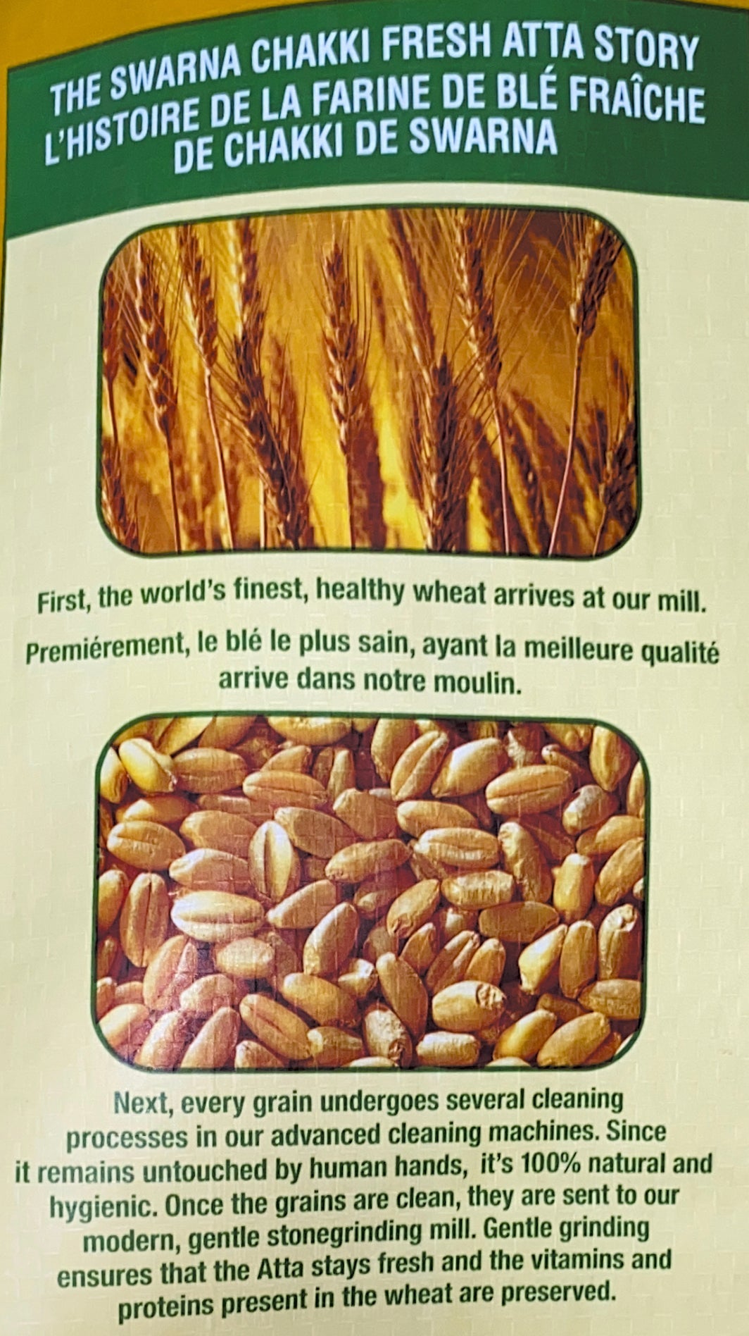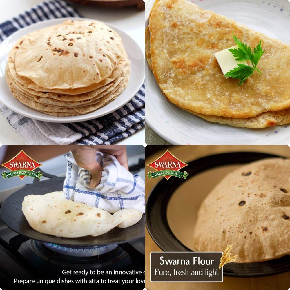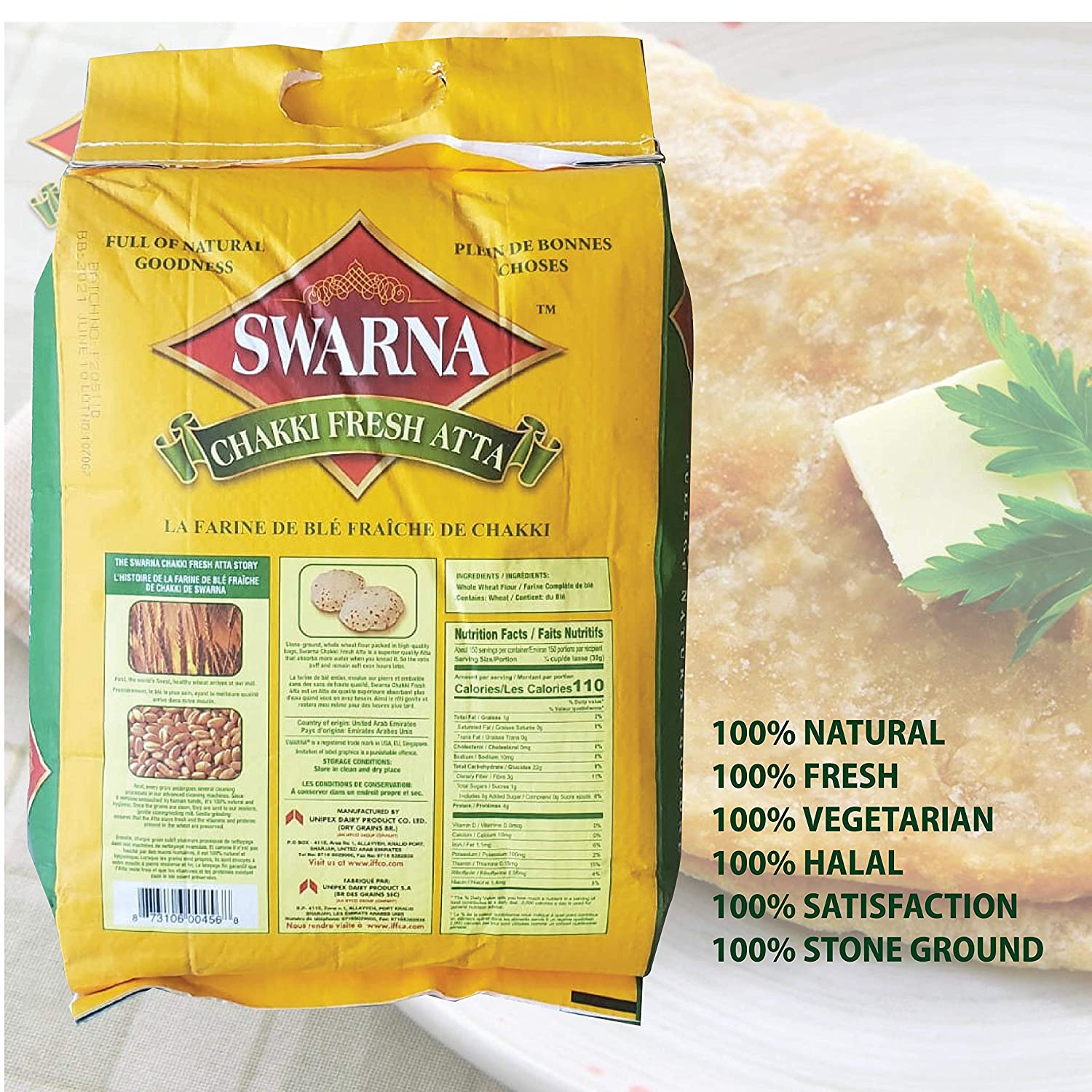 ✔ Swarna Chakki (Stone Grinding) Fresh Atta is made from 100% whole wheat atta, with NO maida mixed. ✔ The stone-ground, whole meal atta (Wheat Flour) ✔ High quality fresh wheat flour imported from UAE ✔ Well Known for Its Nutritive Values. ✔ Roti (Indian pancake or Chapati) puff and will remain soft even hours later! Ingredients: Superior wholemeal wheat flour.