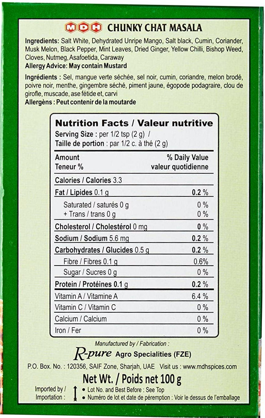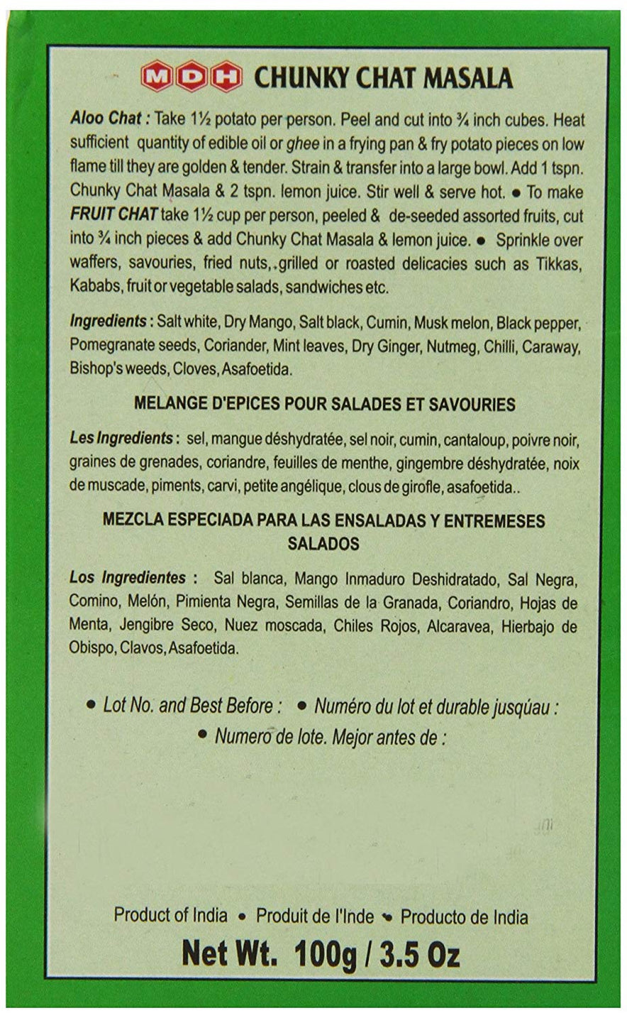 MDH Chunky Chat Masala is an essential spice in Indian cuisine. This tantalizing, tart, tangy, spicy and salty blend of spices is used to enhance the flavors of everything from fruits to savoury snacks.