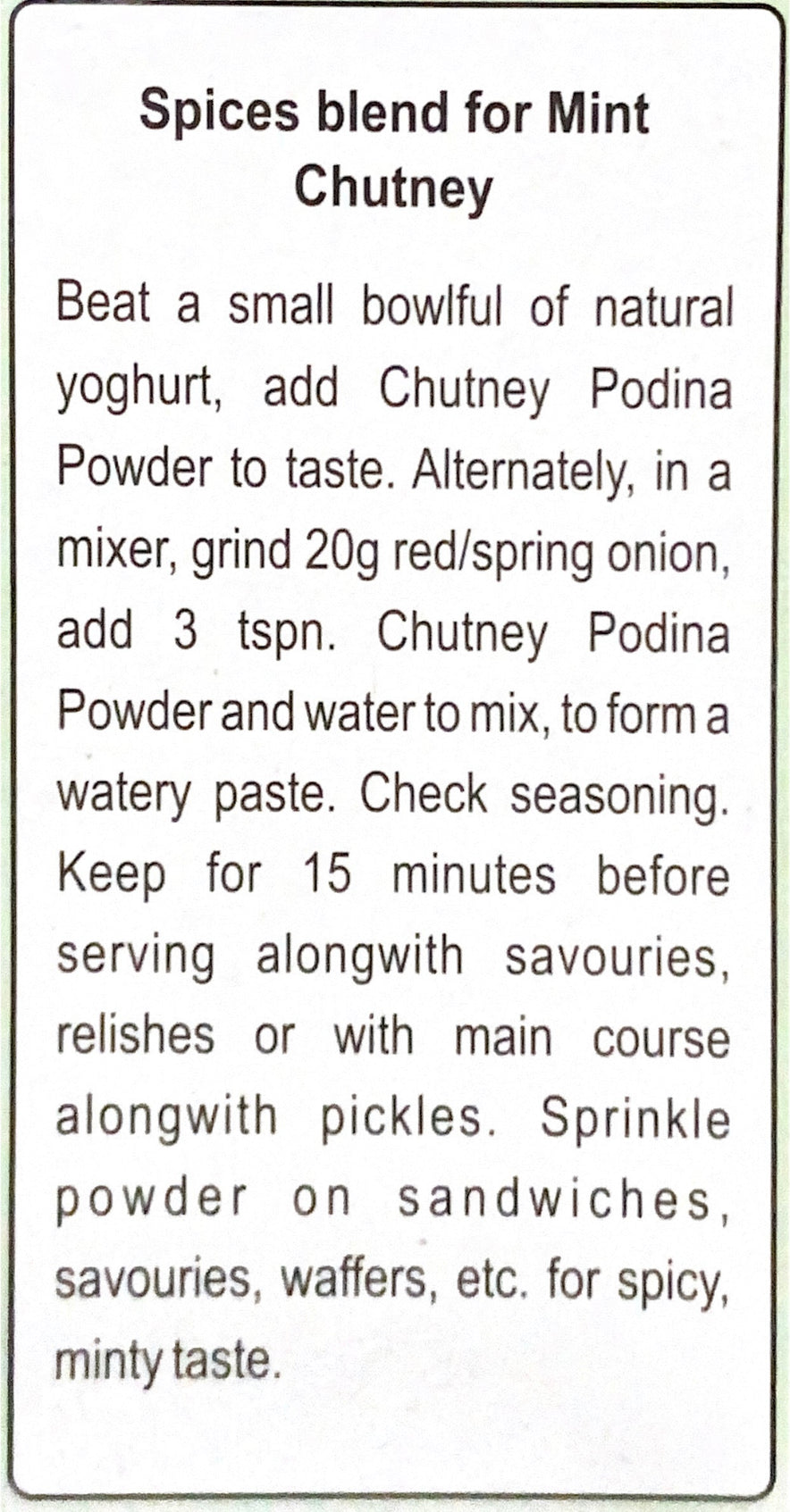 Mint Chutney is made up of fresh Mint leaves or Pudina, which are blended with ginger, garlic and other spices to create a spicy hot but refreshing cool aromatic chutney.;This hot and spicy Mint chutney will add a surprising refreshing taste to any dish, whether it is Indian food or Italian pasta.;Traditionally, Mint Chutney is made at home fresh across Indian sub-continent using fresh Mint leaves together with onion, garlic and ginger. The same freshness has been maintained with this ready-to-eat Mint Chutney.