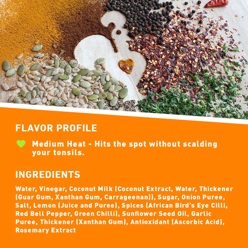 Ingredients: Water, Vinegar, Coconut Milk (coconut Extract, Water, Thickeners (guar Gum, Xanthan Gum, Carrageenan)) (19%), Sugar, Onion Puree, Salt, Lemon (juice And Puree) (5%), Spices (african Bird's Eye Chilli, Red Bell Pepper, Green Chilli), Sunflower Seed Oil, Garlic Puree, Thickener (xanthan Gum), Antioxidant (ascorbic Acid), Rosemary Extract.