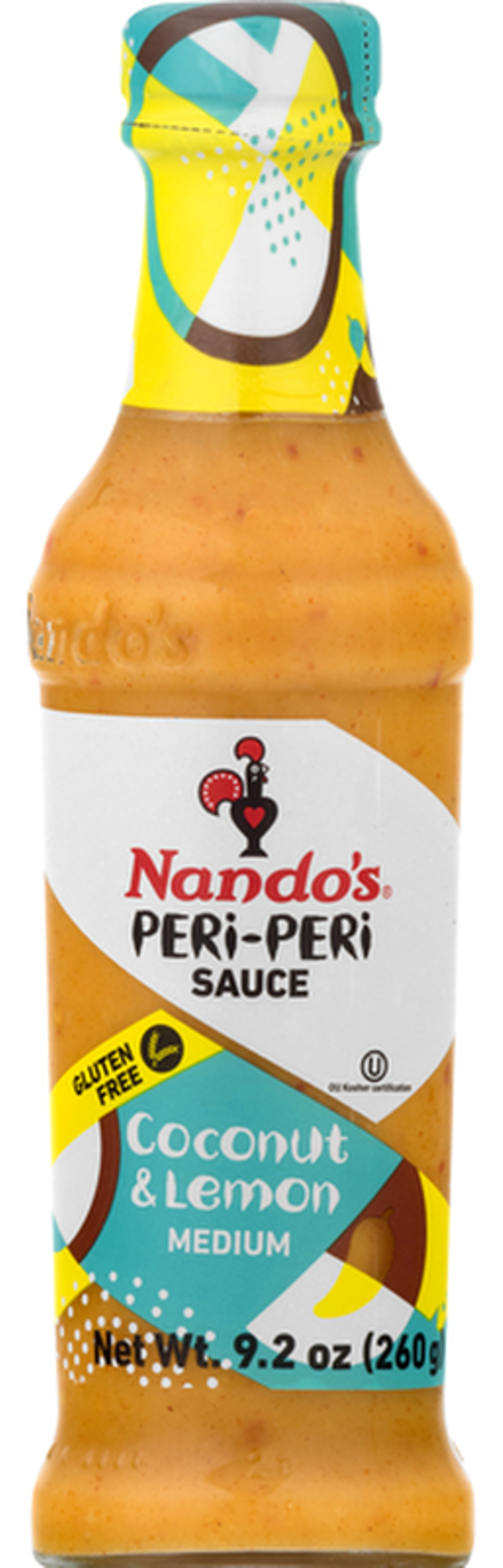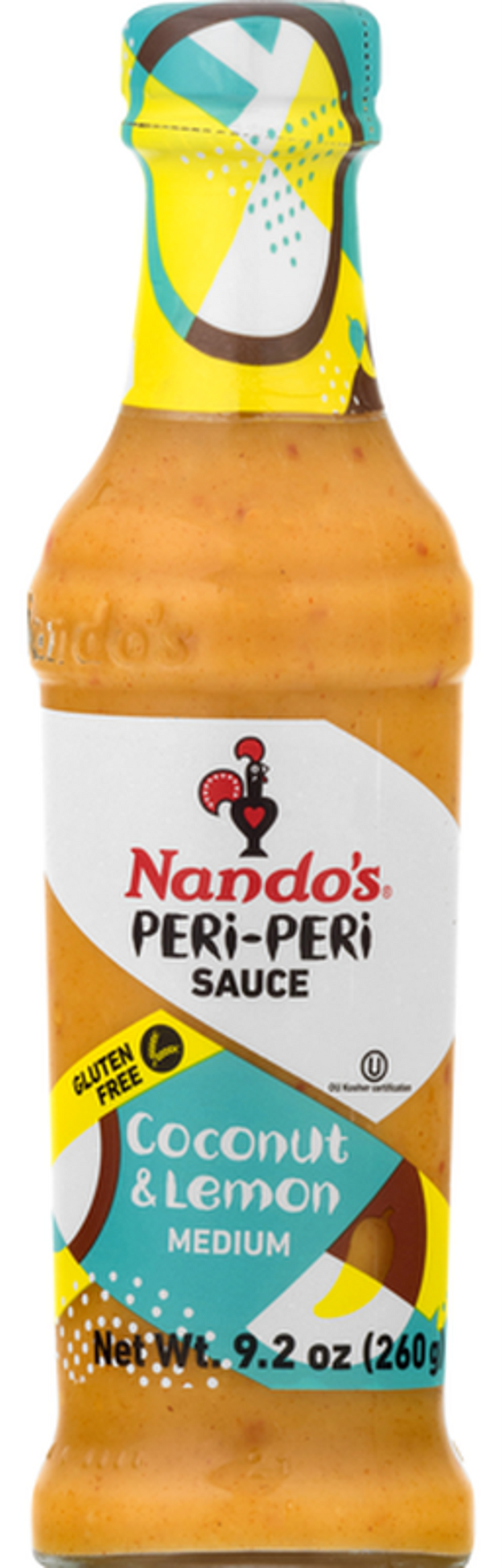 No artificial flavors. Gluten Free. Peri-Peri Ometer: Extra hot. Hot. Medium. Mild. Extra mild. No artificial colors. No looking back. Our Peri-Peri sauce is made with African bird's eye chilli and a blend of ingredients - onion, sun-ripened lemons, garlic and spices. This one has a dash of creamy, smooth coconut milk and a zesty twist of lemon. Peri-Peri is the heart & soul of Nando's and the secret ingredient behind our restaurants worldwide. Condiment. Ingredient. Marinade. Shared with love. nandosperiperi.com/sauces. Recipes and Ideas: nandosperiperi.com/sauces. Born in South Africa. Made in the Netherlands.