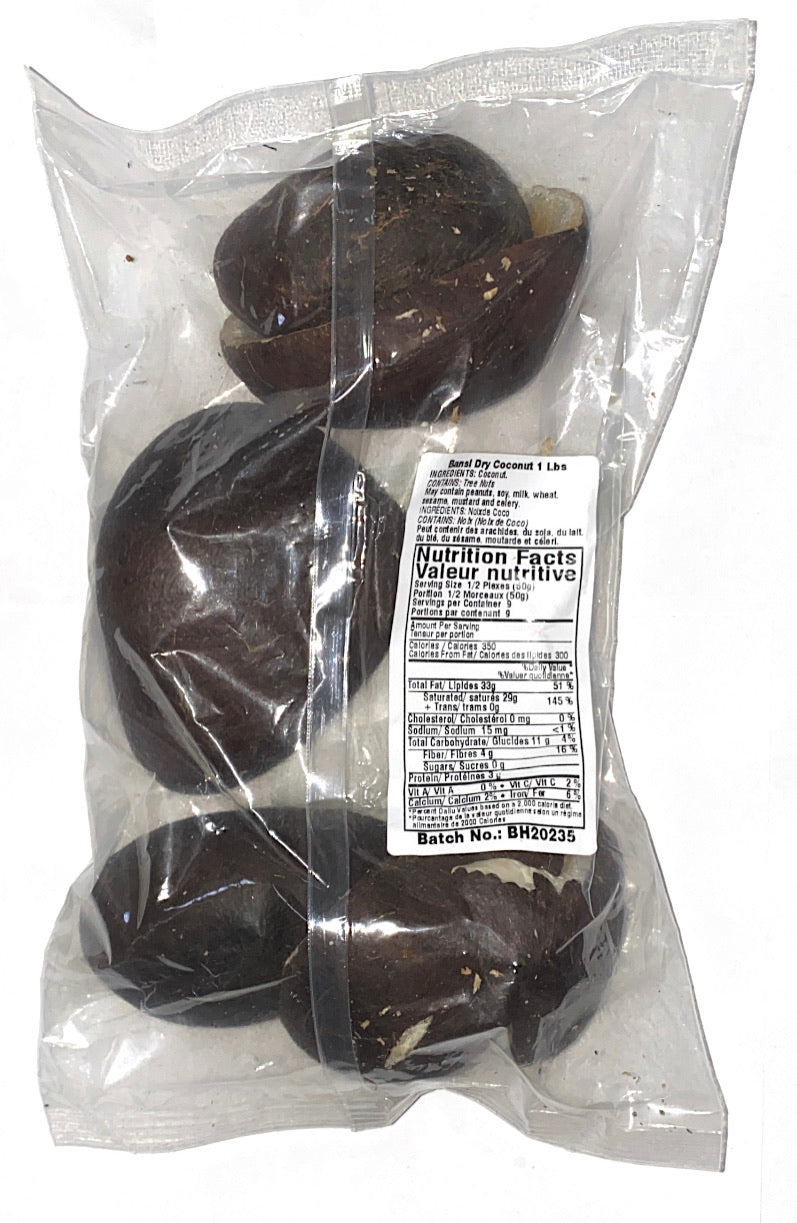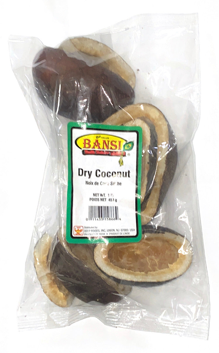 These are small, whole coconuts, halved, and dried. Traditionally the insides are scraped out, and the powder is used in cooking. These are also fun to be creative with; use the halves as a bowl to serve desserts at your next dinner party.