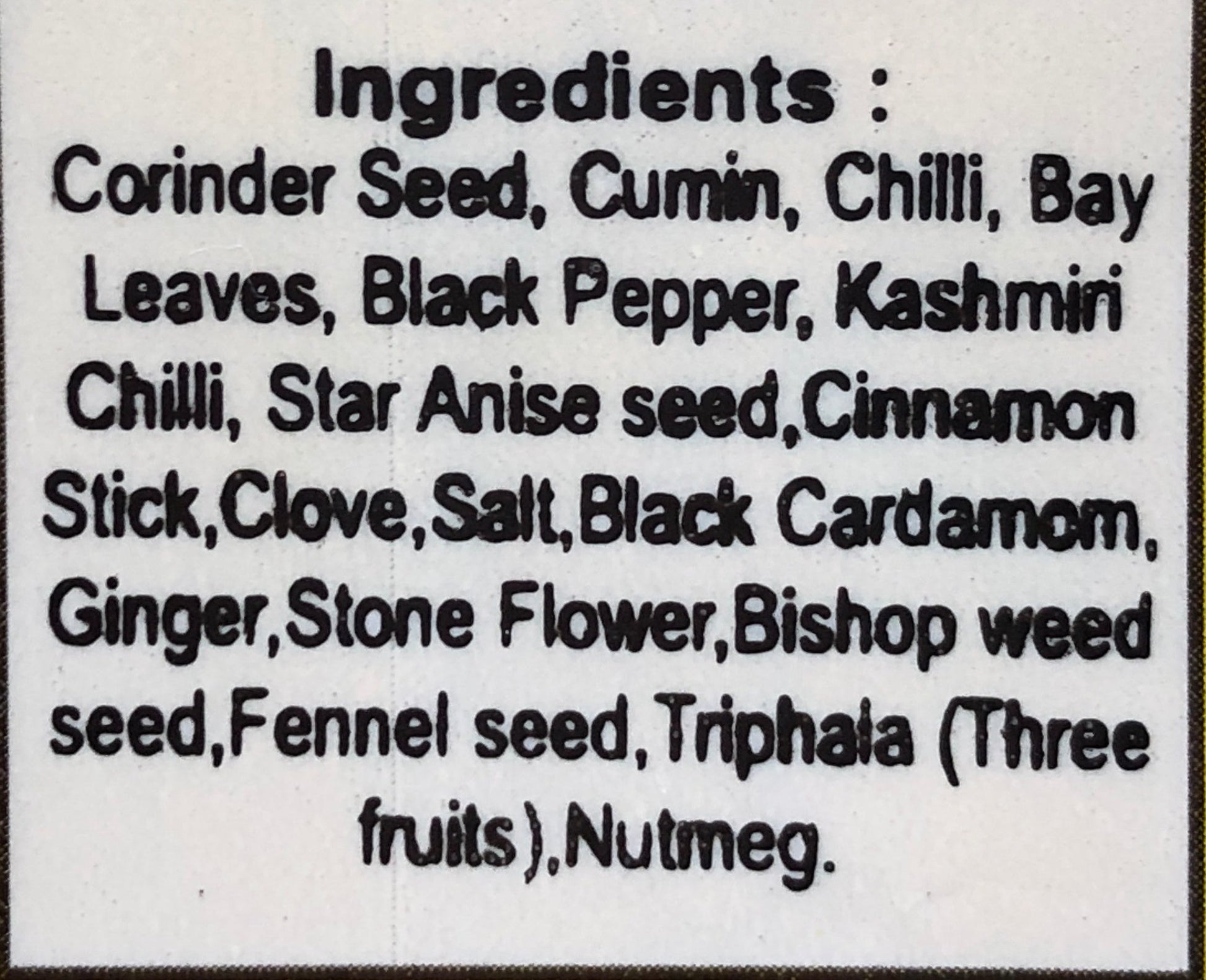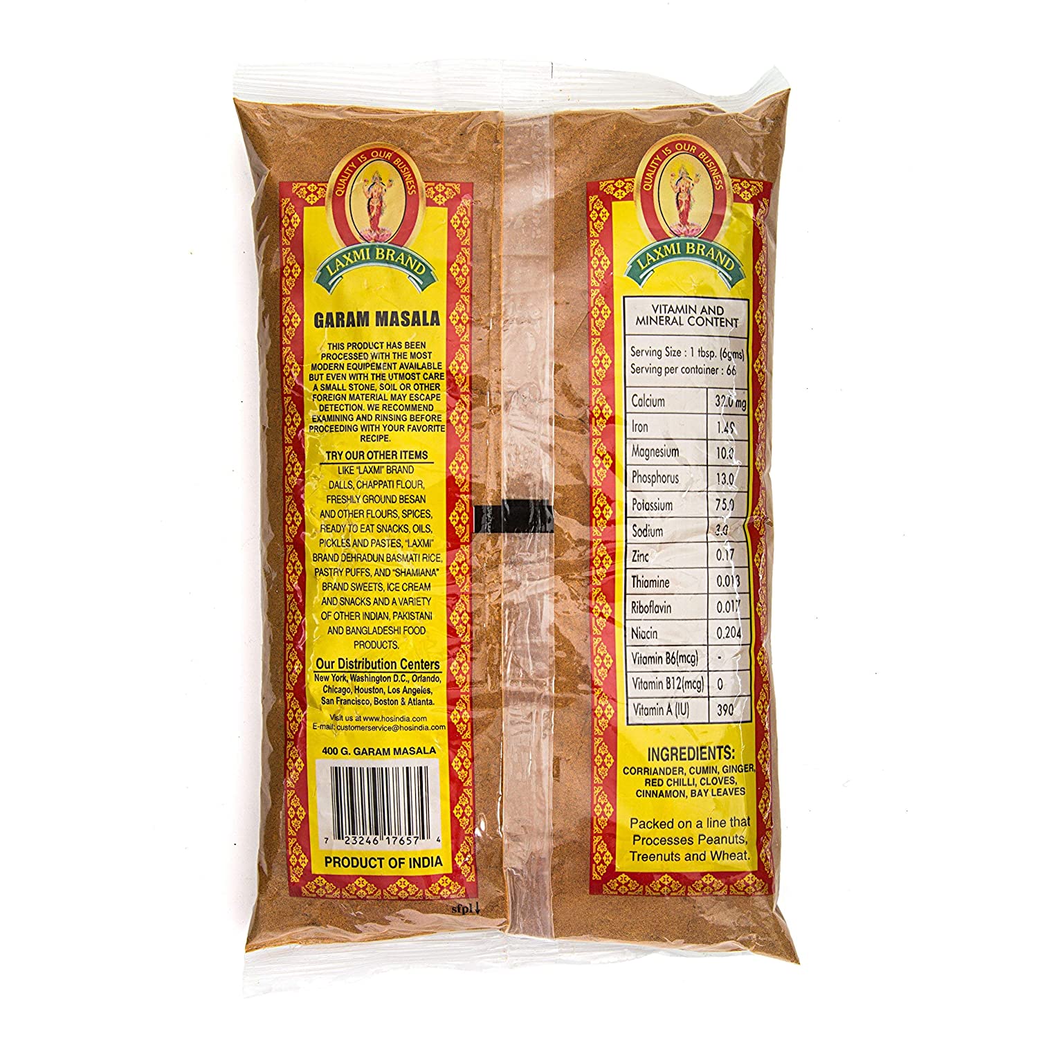 Laxmi Garam Masala is made with natural coriander, cloves, cinnamon, cumin, red chili, black ginger, and bay leaves.