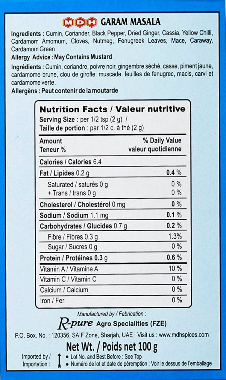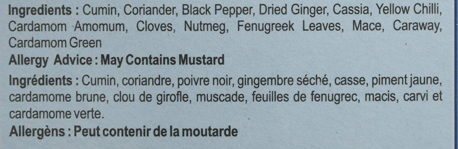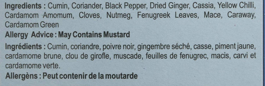 Ingredients : Coriander seeds, Cumin, Black Pepper, Cassia, Dried Ginger, Fenugreek Leaves, Cardamom Amomum, Yellow Chillies, Cloves, Nutmeg, Mace.