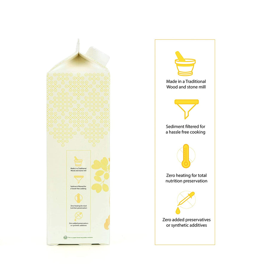 Our wood cold pressed oil, locally called maracheku oil or kachi ghani oil, is made in a stone mill with a wood pastel that rotates only 14 times a year, such as an old aux-powered mill. . It prevents heating and preserves correct nutrition, taste and aroma. Our products are made to delight you with a splatter-free cooking experience. Oil is filtered in a cotton filter, while good health is also ensured by using zero synthetic additives or preservatives. We have invested our best efforts and past profits in moving to a new eco-friendly gable top carton packaging. Carton also increases the shelf life of the product by not exposing it to sunlight.