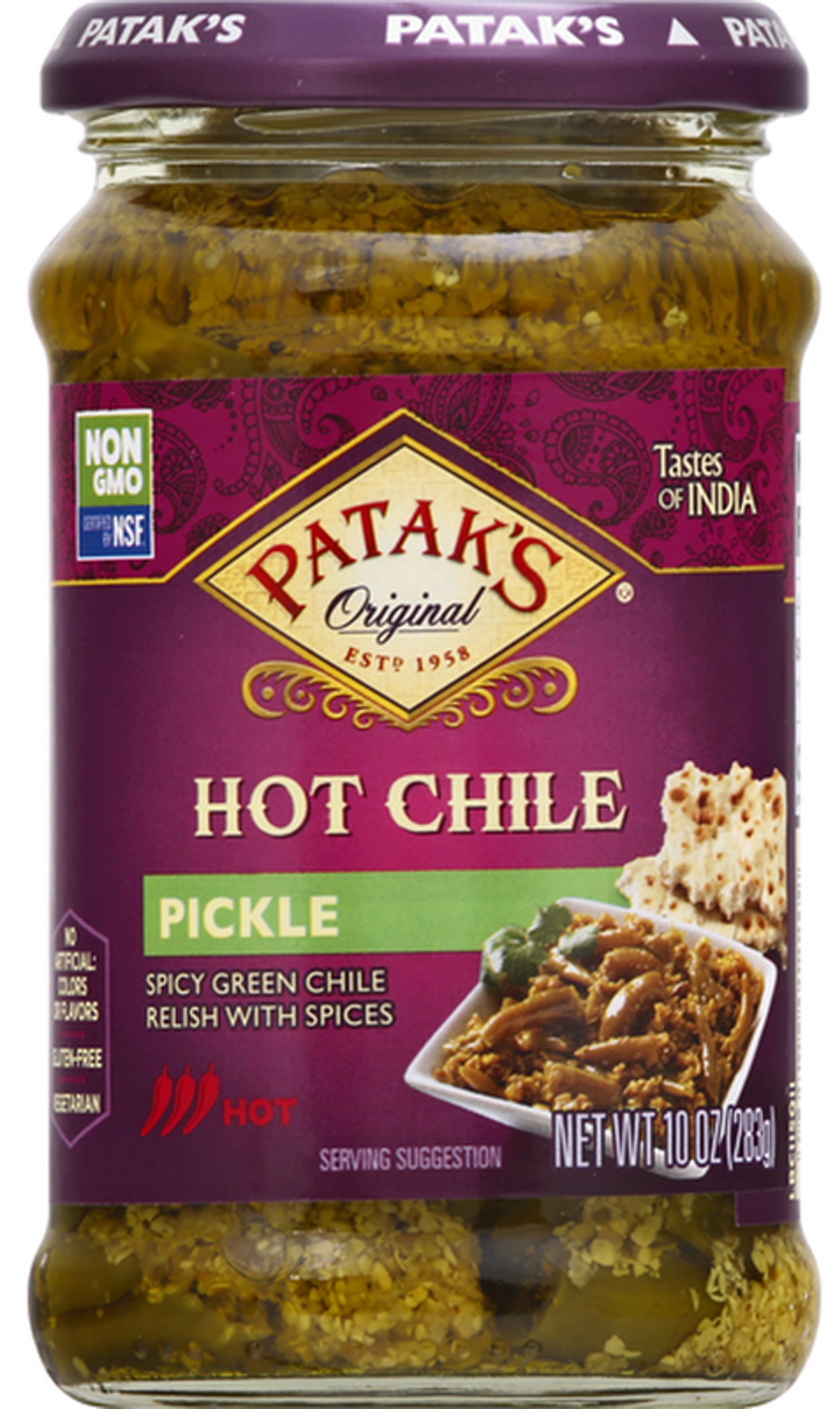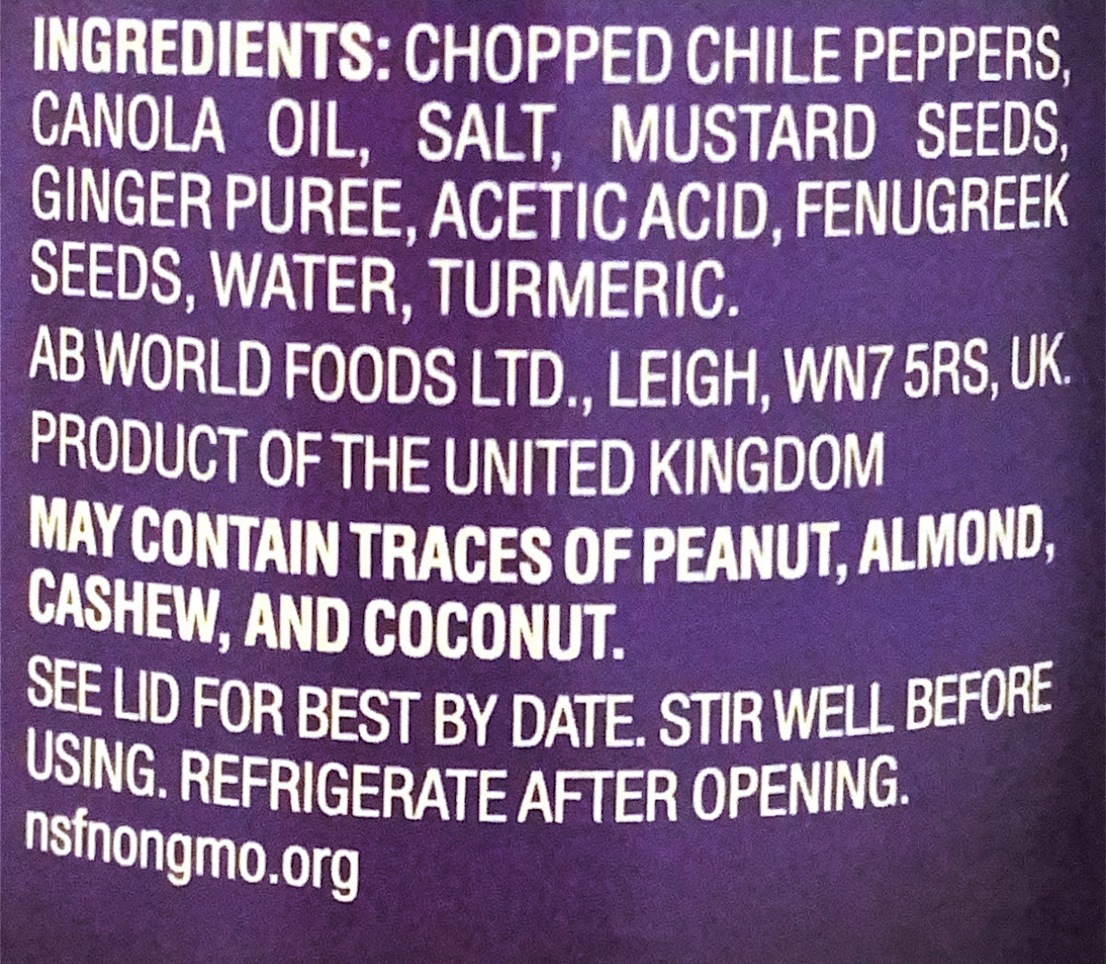 INGREDIENTS: CHOPPED CHILE PEPPERS, CANOLA OIL, SALT, MUSTARD SEEDS, GINGERPUREE, ACETIC ACID, FENUGREEK SEEDS,WATER, TURMERIC.