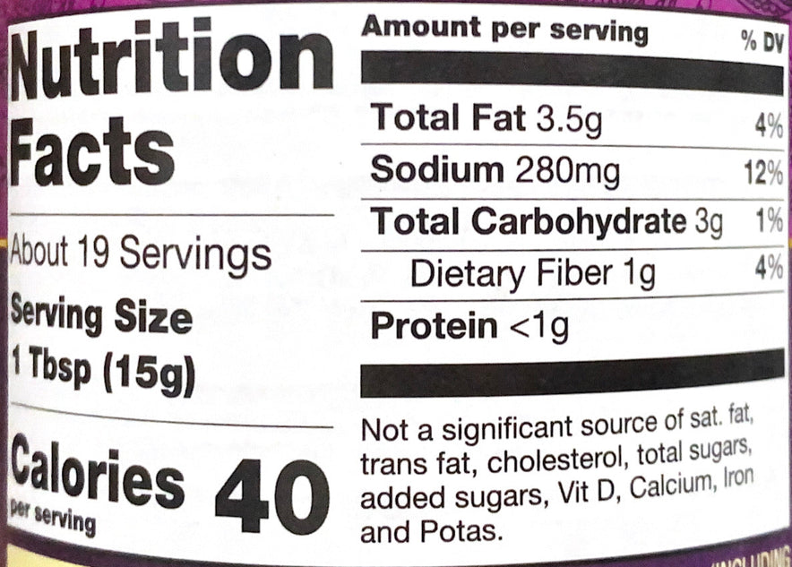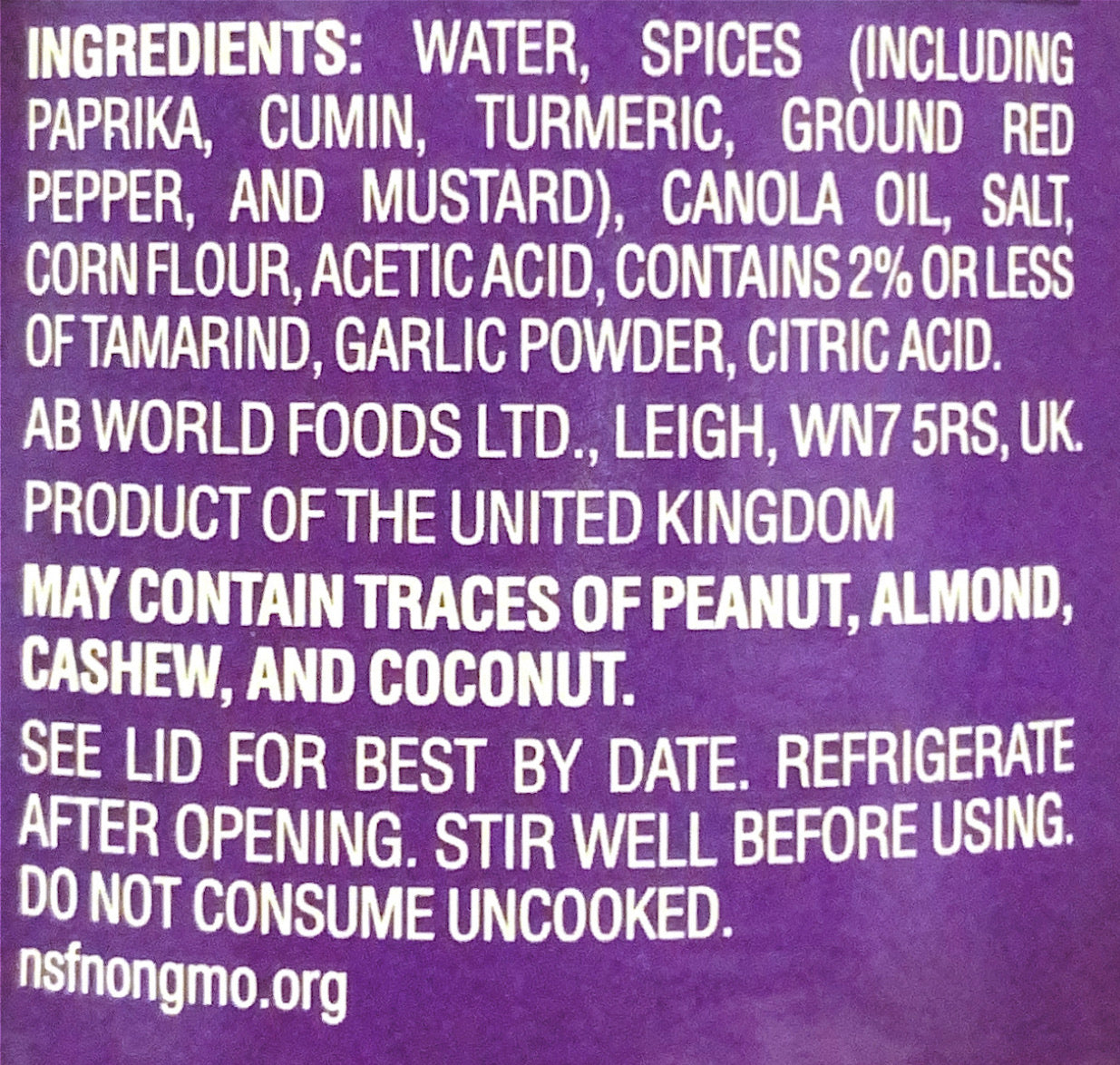 INGREDIENTS: WATER, SPICES (INCLUDING PAPRIKA, CUMIN, TURMERIC, GROUND RED PEPPER, AND MUSTARD), CANOLA OIL, SALT, CORNFLOUR, ACETICACID, CONTAINS 2%OR LESS OF TAMARIND, GARLIC POWDER, CITRIC ACID.
