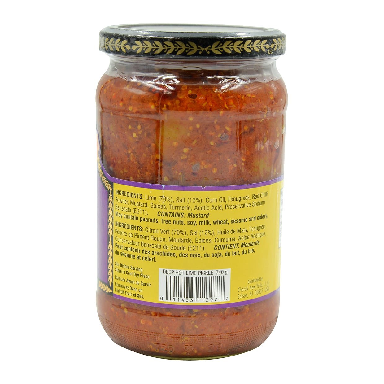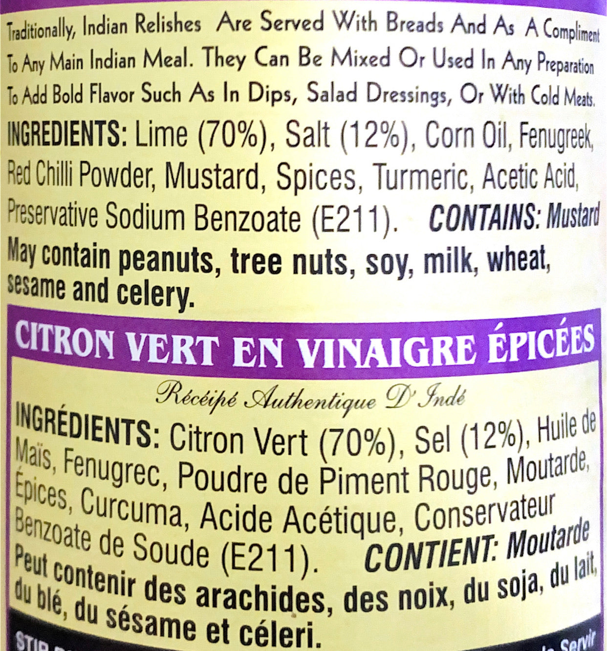 Ingredients: LIME (70%), SALT (12%), CORN OIL, FENUGREEK, RED CHILLI POWDER, MUSTARD, SPICES, TURMERIC, ACETIC ACID, PRESERVATIVE SODIUM BENZOATE (E211).