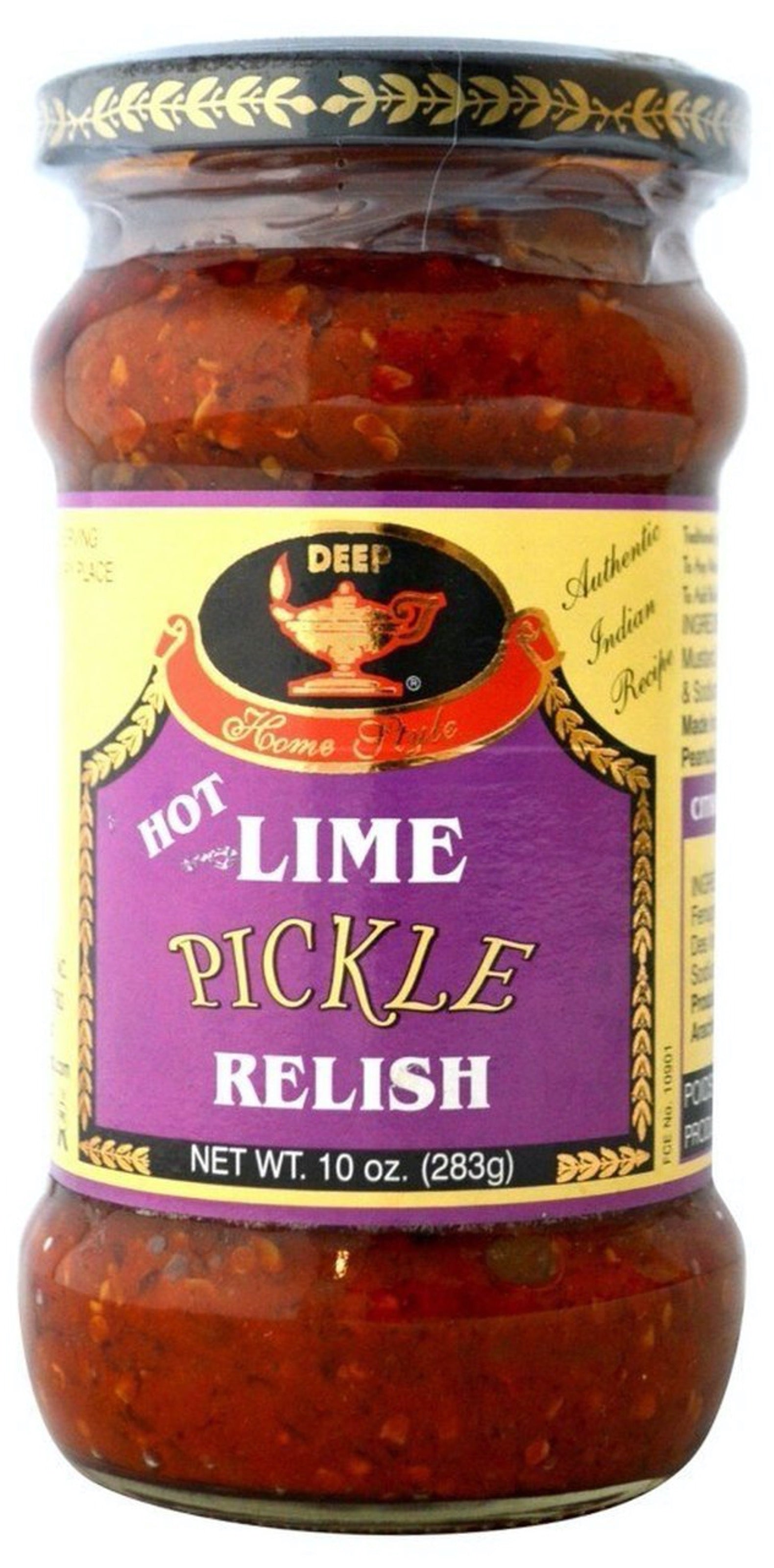Deep Home Style Hot Lime Pickle Relish is an authentic Indian recipe. This delicious relish is made with the finest ingredients: Lime, salt, corn oil, fenugreek, mustard, red chilli, turmeric, and savory spices. It is traditionally served with breads, or, as an excellent compliment to any main Indian meal, such as rice dishes or breads. They can be mixed or used in any preparations to add bold flavor such as dips, salad dressings, with cold meats, or even pizza! For dips, try blend one part relish with five parts mayonnaise to make a superb savory dip that everyone will love.