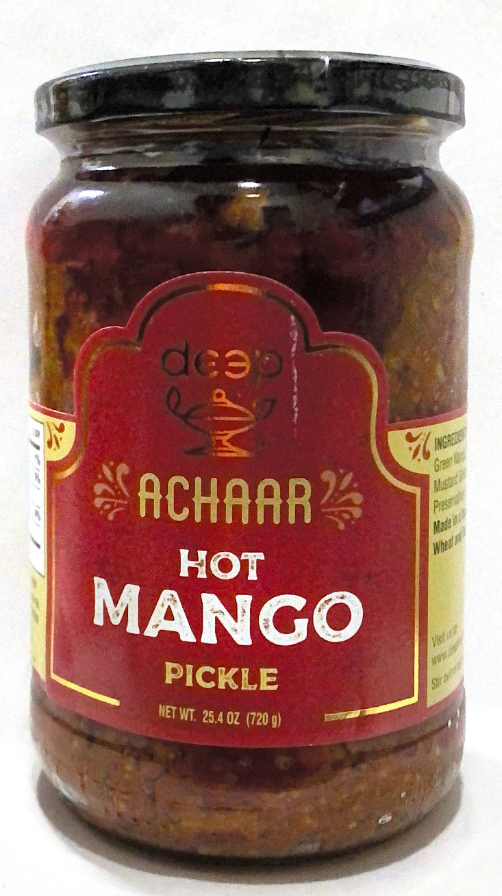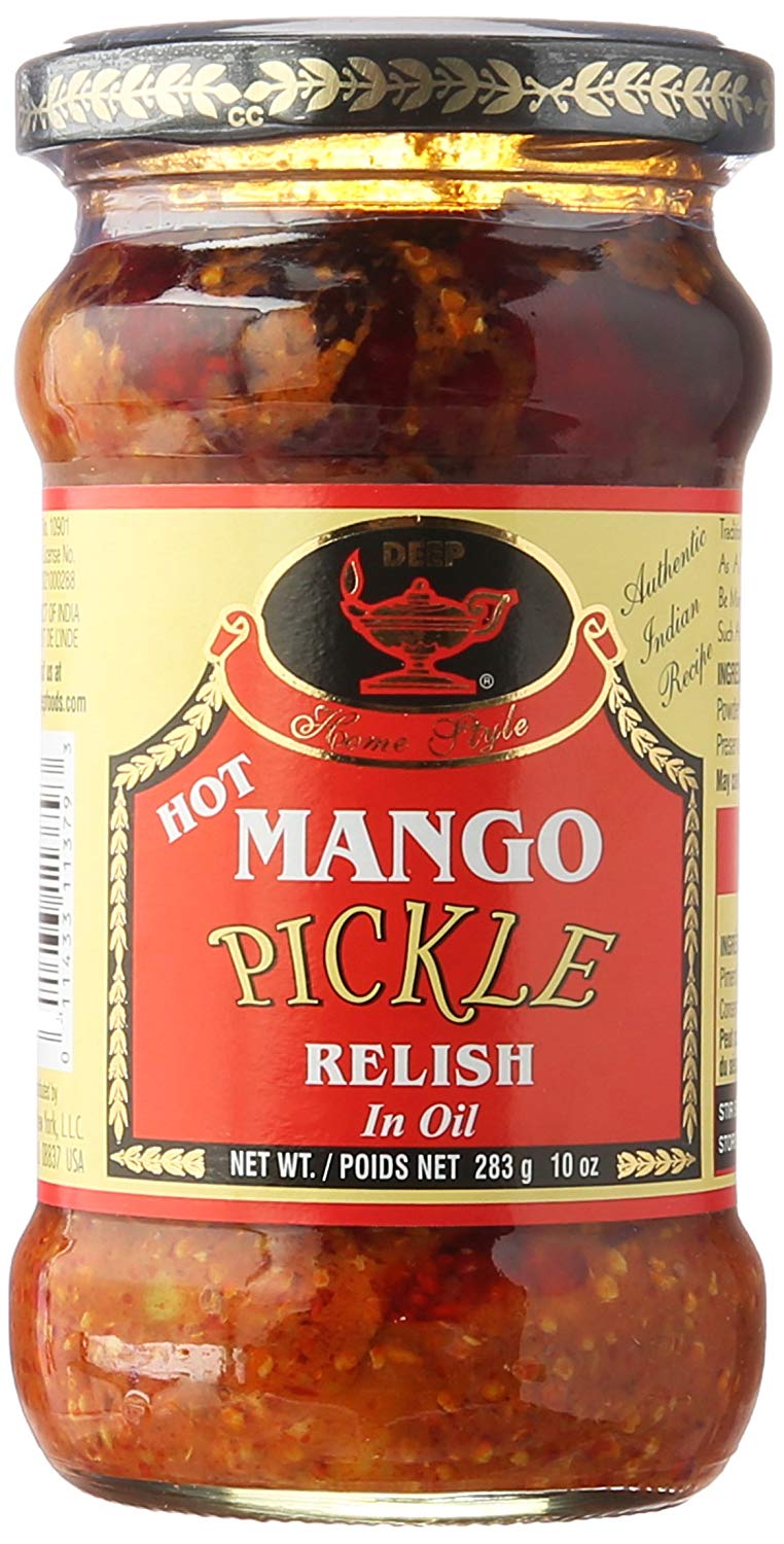 Deep Home Style Hot Mango Pickle Relish is an authentic Indian recipe. This delicious hot mango pickle relish is made with the finest ingreidents: mango, salt, corn oil, fenugreek, mustard, chilli powder, turmeric, and savory spices. It is traditionally served with breads, rice dishes, or, as an excellent compliment to any main Indian meal. They can be mixed or used in any preparations to add bold flavor such as dips, salad dressings, or with cold meats.