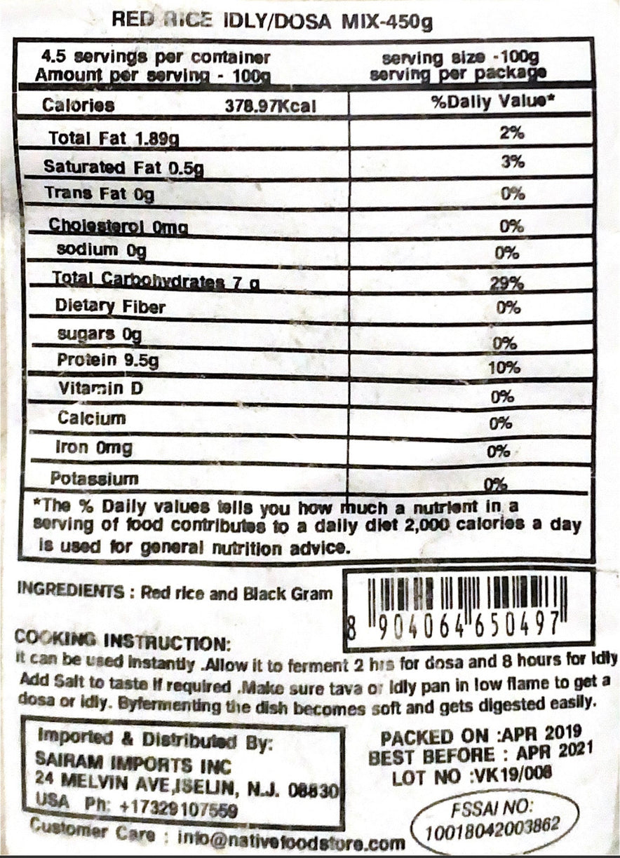Red Rice Idly/Dosa Mix made from traditionally processed Red rice added with black gram which makes perfect substitute for ordinary Rice Dosa. Red rice is rice that has not been through the process of grinding or flaking skin completely, so the layer of skin that surrounds the grain still exists. This is the layer of skin that contains nutrients and fiber that are important for the body.
