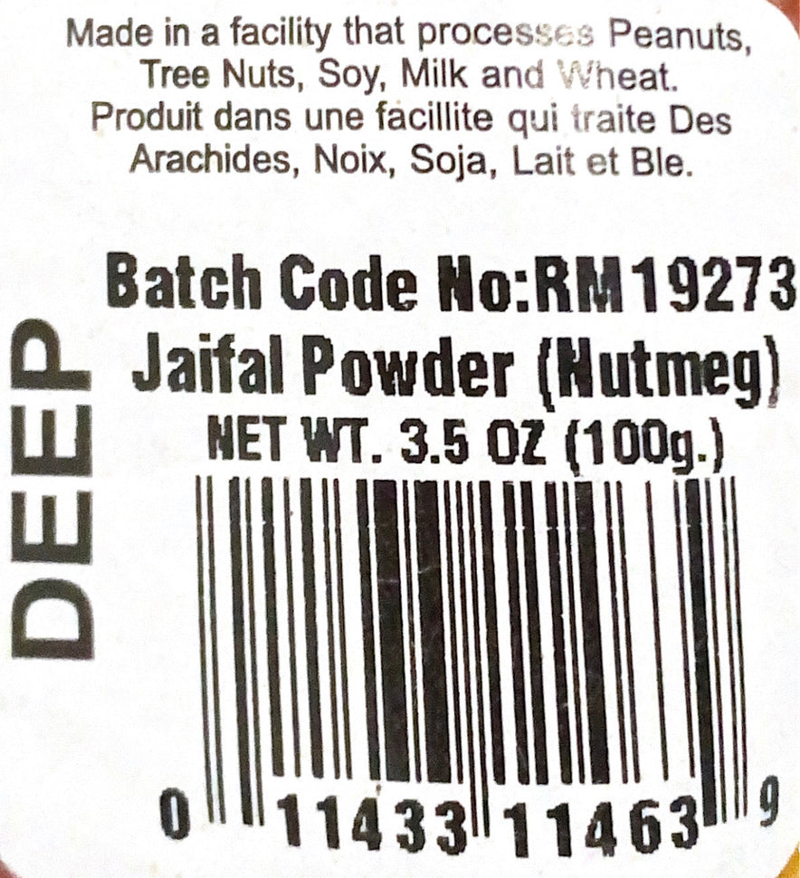DEEP Jaifal Powder Nutmeg 3.5oz|Nutmeg ”Myristica fragrans” is the seed of the nutmeg tree. Nutmeg trees may exceed 60 feet in height and are grown widely in Grenada and Indonesia. Once the shell is removed from the seed it is dried in the sun. Here, nutmeg can be bought as whole or in powder form. Nutmeg has been popular in Great Britain since the spice trades, and are often found in sweet milky dishes such as custards and puddings. It is an excellent complement with vegetables such as onions, cauliflowers, spinach and potatoes. They can also be found in milk-based sauces, fruitcakes, pies and wine..
