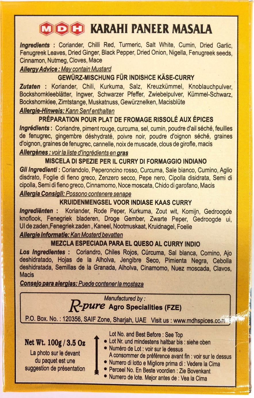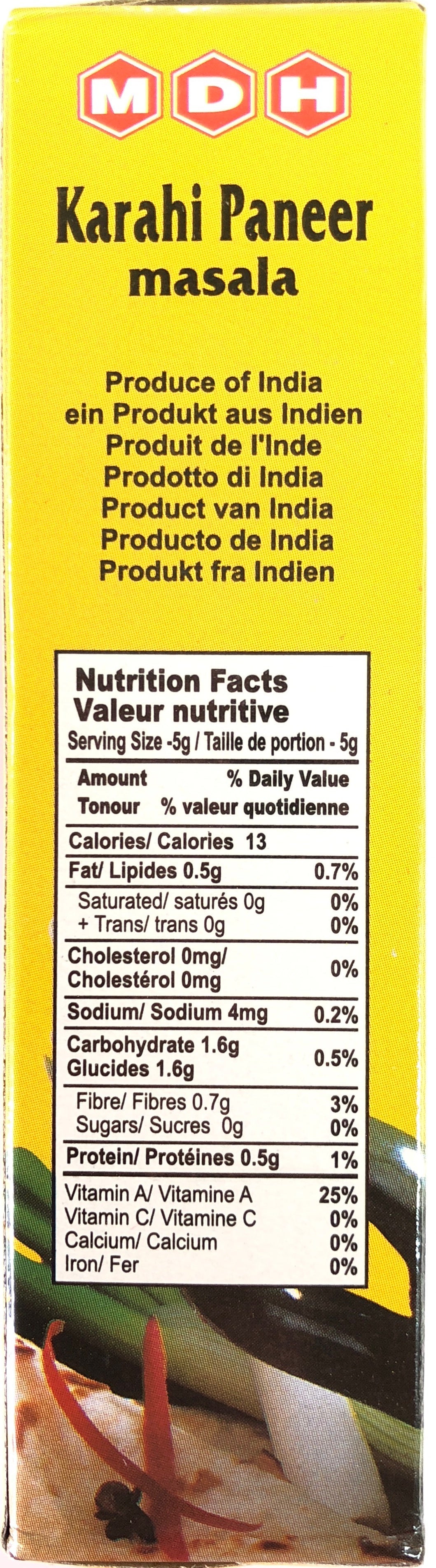 MDH is one of the best known brand of Indian Spices. Paneer masala is a mixture of spices used to add flavor to karachi paneer (hard cubes of cheese), which is an prominent Indian vegetarian dish.
