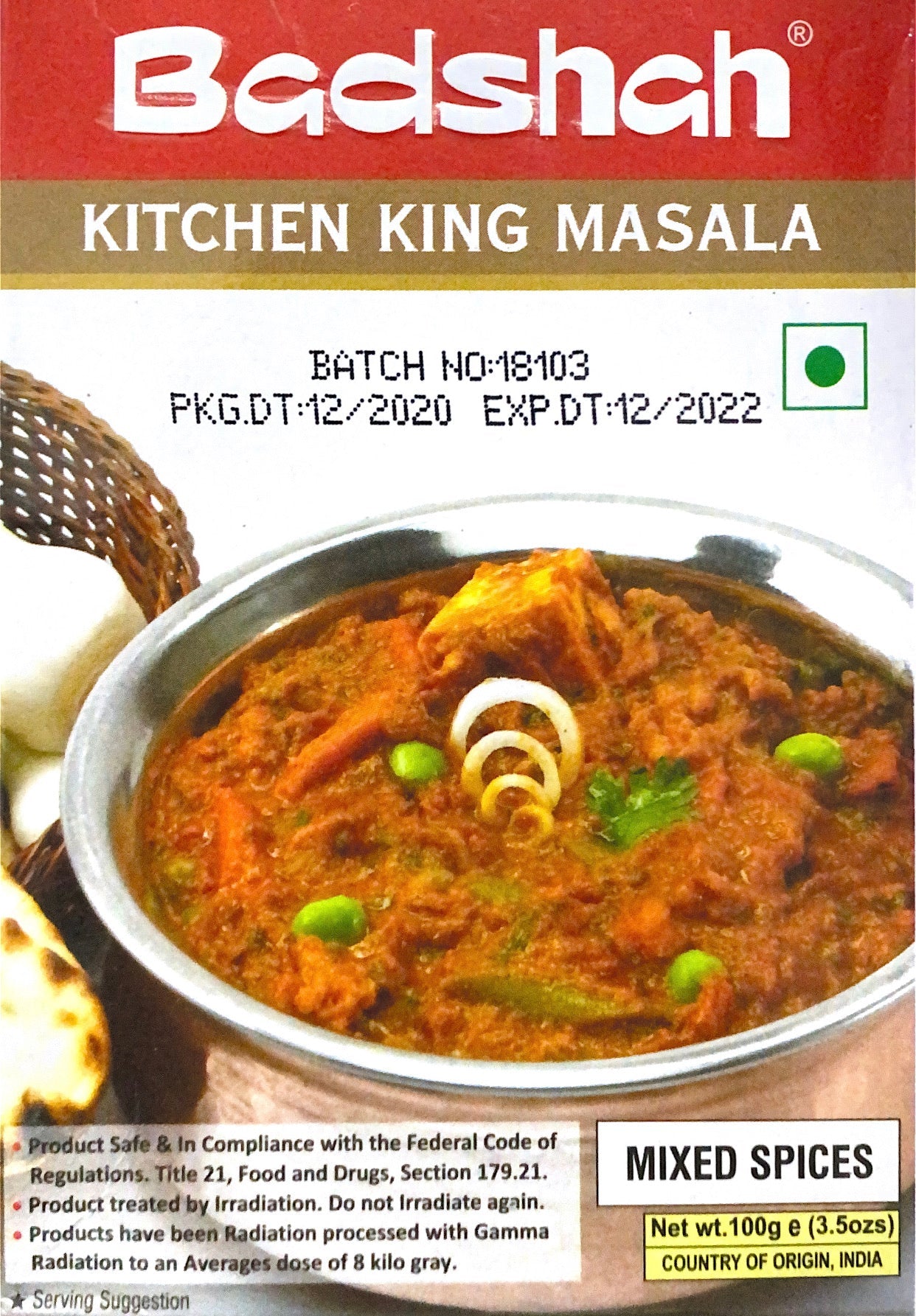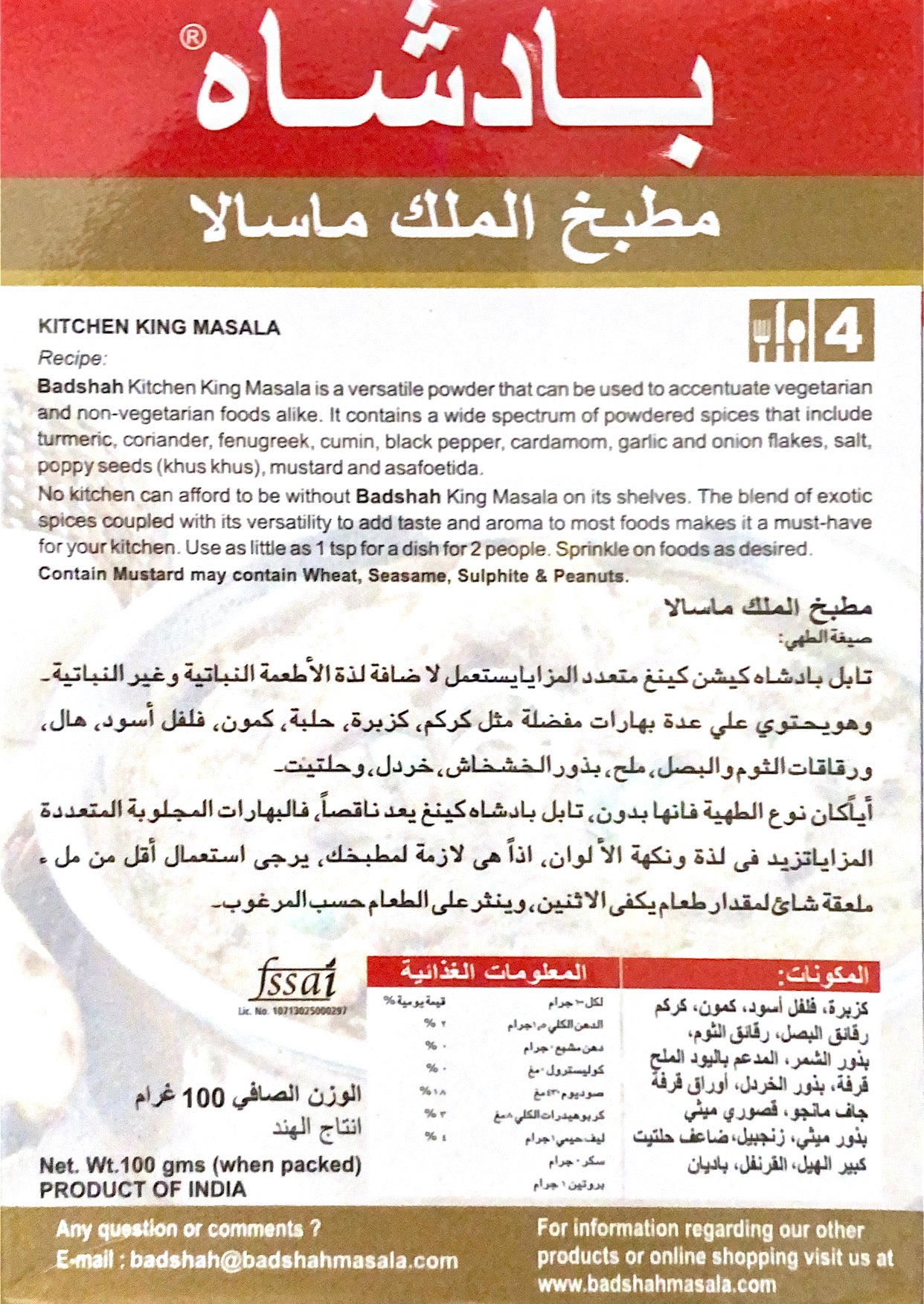 Badshah Kitchen King Masala is a versatile powder that can be used to accentuate vegetarian and non-vegetarian foods alike. It contains a wide spectrum of powdered spices that include Turmeric, Coriander, Fenugreek, Cumin, Black Pepper, Cardamom, Salt, Poppy seed (Khus khus), mustard and asafoetida. No kitchen can afford to be without badshah King Masala on its Shelves. The blend of exotic spices coupled with its versatility to add taste and aroma to most foods makes it a must have for your kitchen. Use as little as 1 tsp for a dish for 2 people. Sprinkle on.