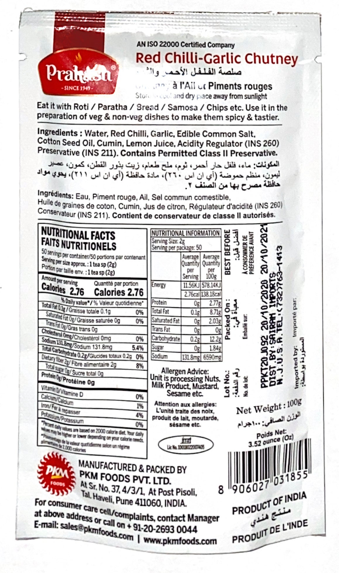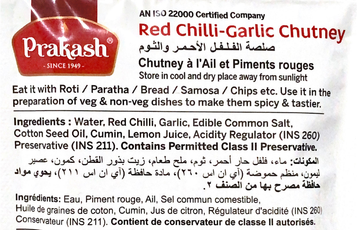 Red Chili Garlic Chutney is a chutney made with red chili peppers and garlic as the main ingredients in it. This chutney is famous in the state of Maharashtra in India. Ingredients: water, red chili, garlic, salt, cottonseed oil, cumin, lemon juice.
