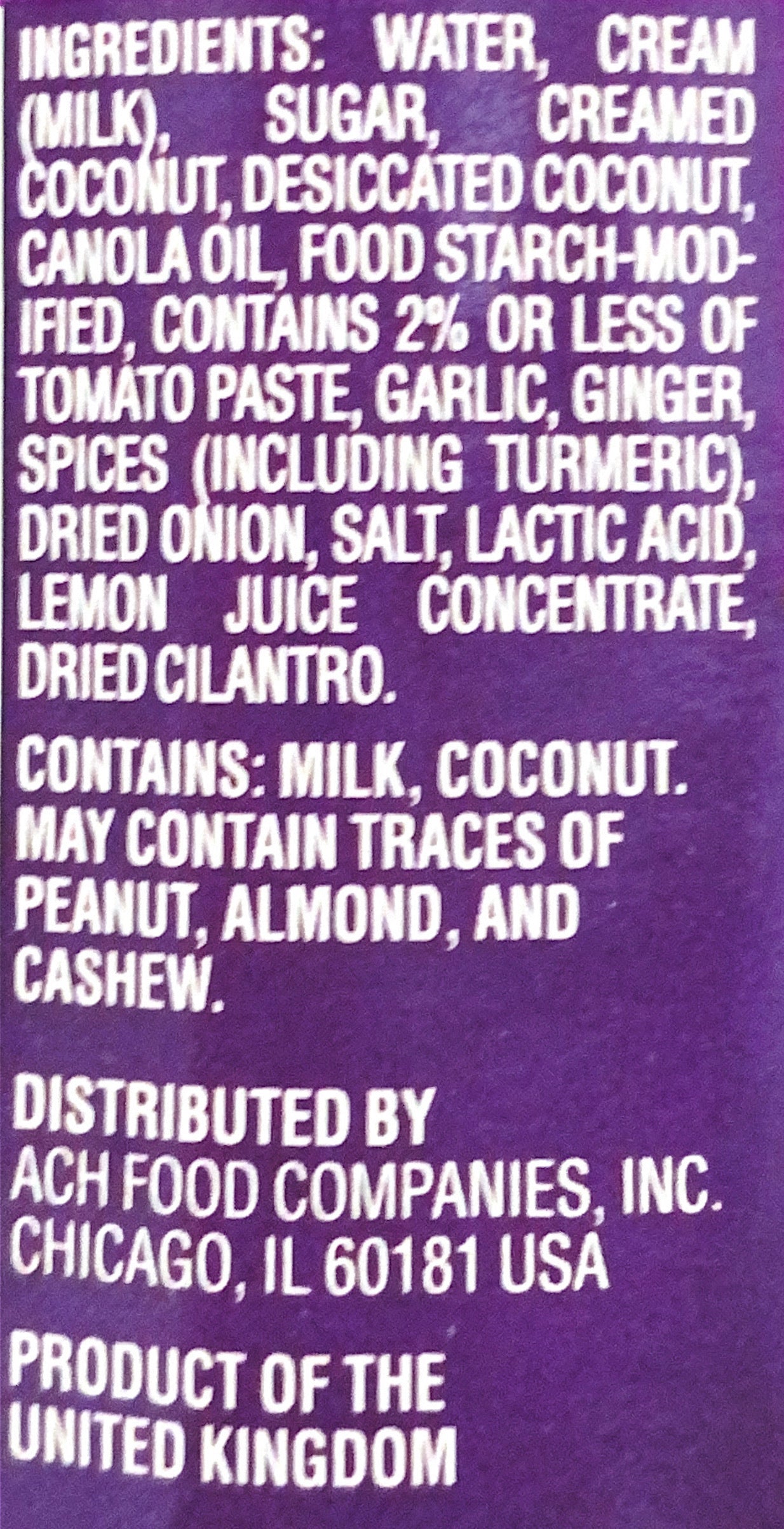 INGREDIENTS: WATER, SUGAR, DESICCATED COCONUT, CREAM, COCONUT PASTE, ONION, CANOLA OIL, FOOD STARCH-MODIFIED, CONTAINS 2% OR LESS OF TOMATO PASTE, HEAVY CREAM, GINGER, GARLIC, SPICES (INCLUDING TURMERIC), SALT, LACTIC ACID, LEMON JUICE CONCENTRATE, DRIED CILANTRO LEAF.Â