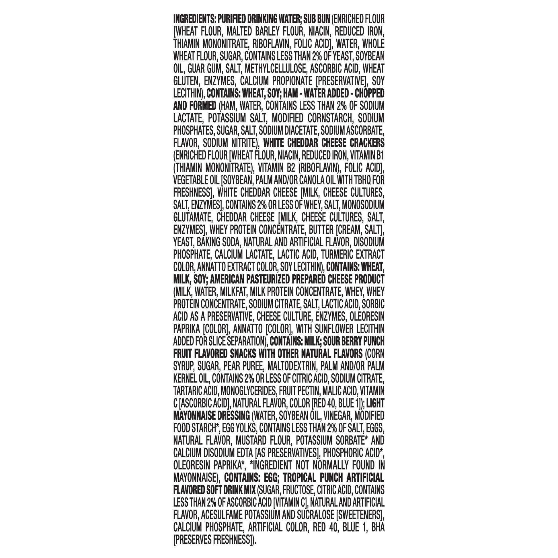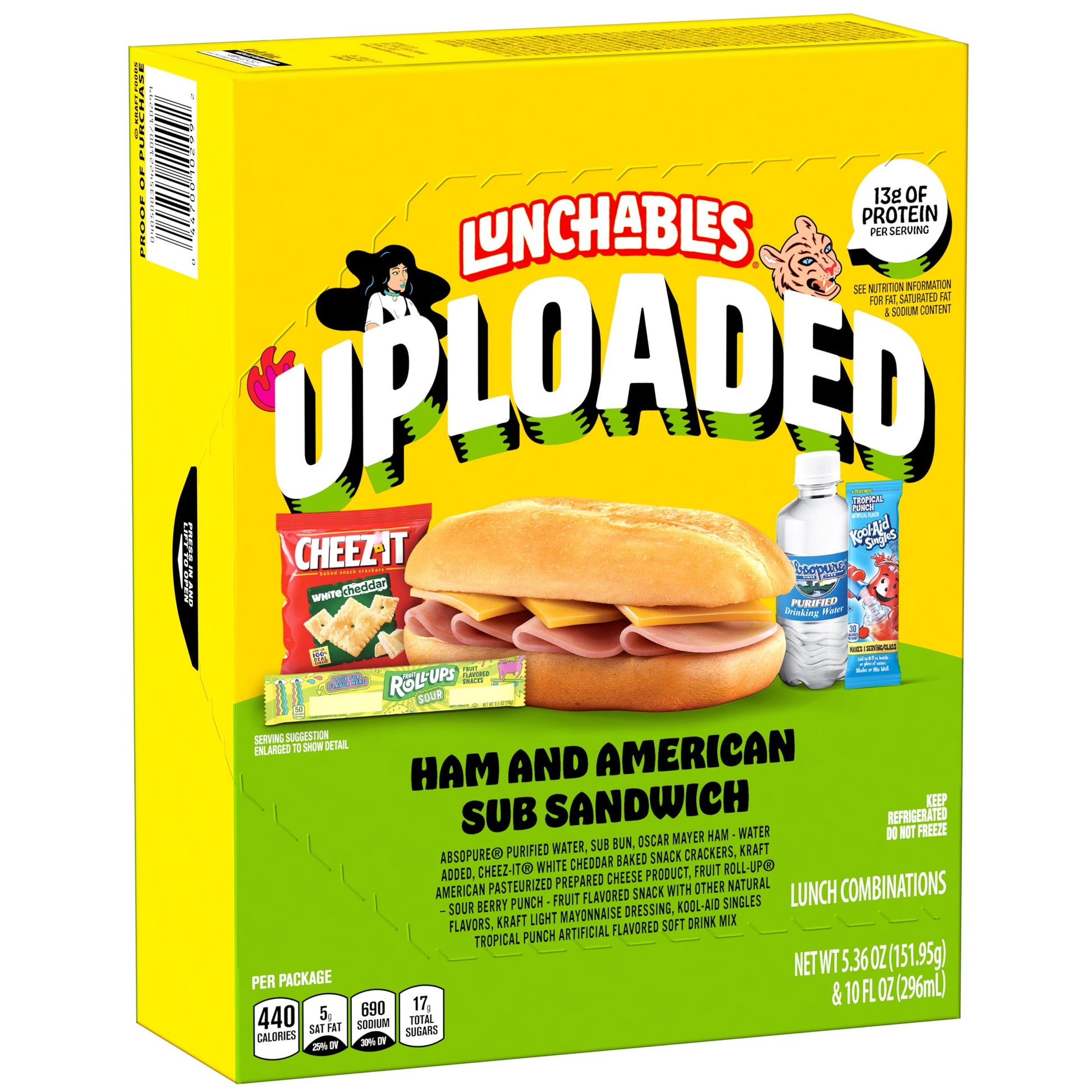 Welcome to a world of new proportions, built by kids! Bring some fun to their everyday with Lunchables Uploaded Ham and American Sub Sandwich Meal Kit. Perfect for school lunch, an after school snack or a convenient on-the-go meal anytime, anywhere, Lunchables offers a tasty, buildable option for kids, approved by parents. Packaged in a handy serving tray with individual compartments and a sealed, peel-back top, our meal kit makes lunchtime exciting. Whether they’re stacking slices of ham and cheese or creating inventive flavor combinations, our easy kids lunch box is a fun option that contains 13 grams of protein and 2 grams of fiber per serving. Each box includes a bottle of Absopure purified water with a packet of Kool-Aid Tropical Punch drink mix to combine with it, a sub bun, Oscar Mayer ham deli lunch meat, Kraft American cheese, a Kraft Light Mayo packet, and a Fruit Roll Up Sour for dessert. Keep Lunchables refrigerated/ chilled until opening. Lunchables provides your family with real, epic food that’s delightfully unexpected.