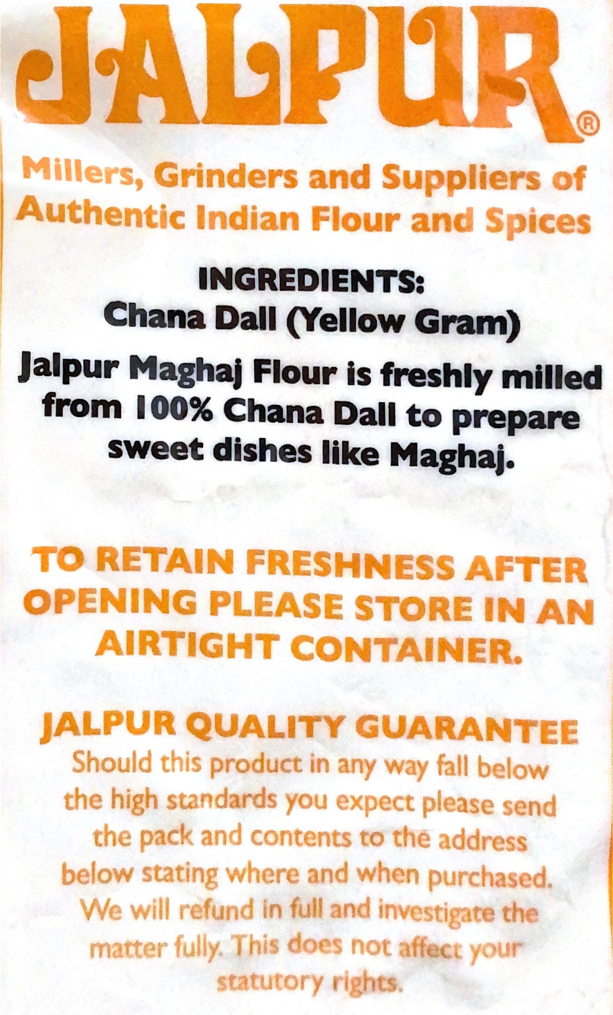 Jalpur products are packed and produced in a mill that handles wheat, gluten, nuts, peanuts, mustard, sesame and soya. All products are dairy free and suitable for vegetarians.