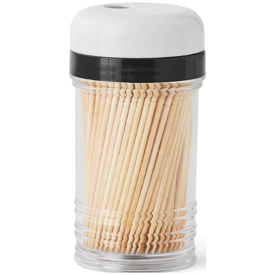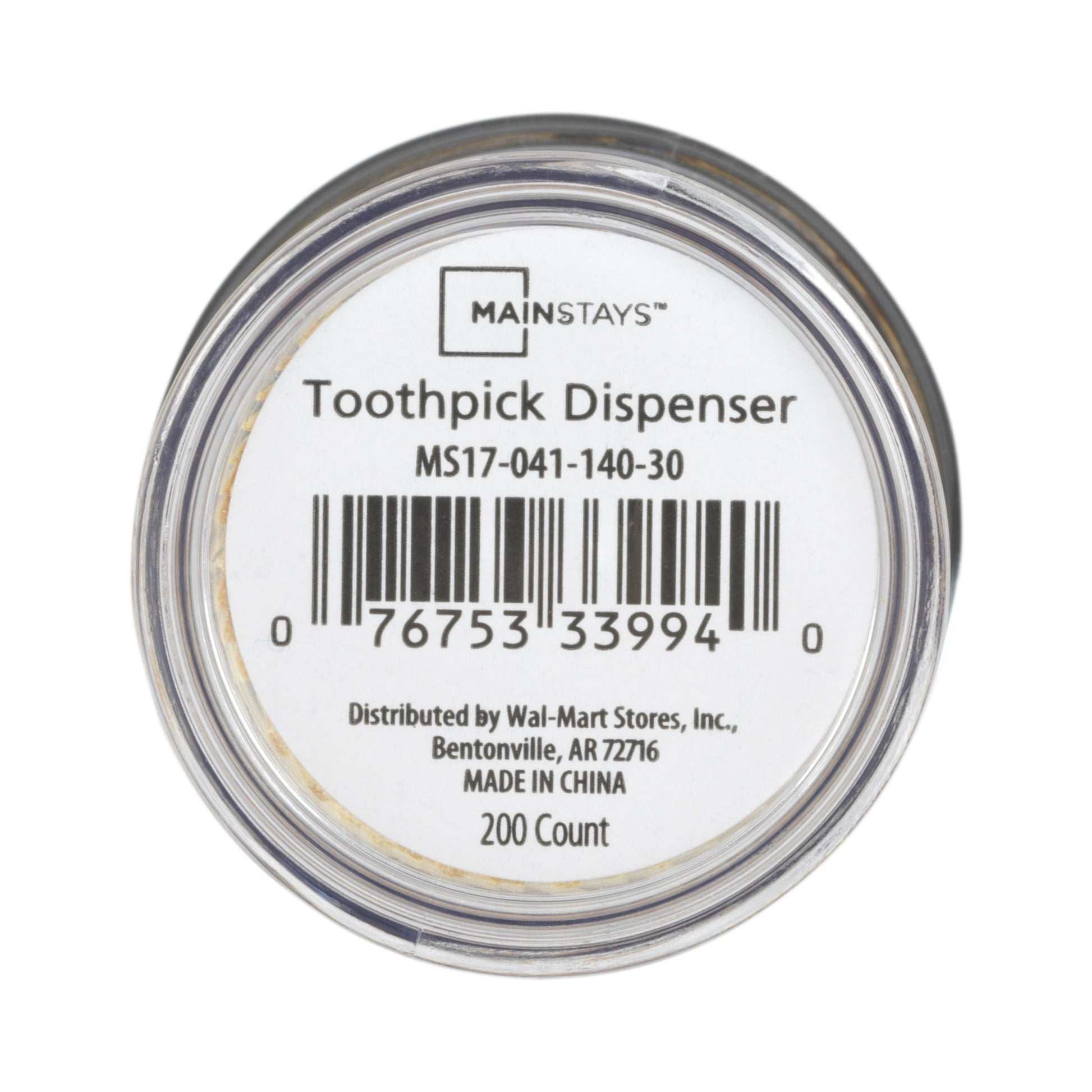 Complete your collection of everyday kitchen gadgets with the Mainstays Toothpick Dispenser Set. Functional and convenient, this toothpick holder comes complete with 200 single-point wooden toothpicks to allow for an easy way to have toothpicks on hand whenever you need one. The easy-to-use dispensing lid twists open to release one toothpick at a time and twists closed to keep them securely inside the container, offering a more sanitary method of reaching for toothpicks. The included toothpicks are great for use after meals or serving appetizers and small kabobs. Made with durable transparent plastic, the dispenser provides easy viewing of the remaining toothpicks inside and offers years of quality use.