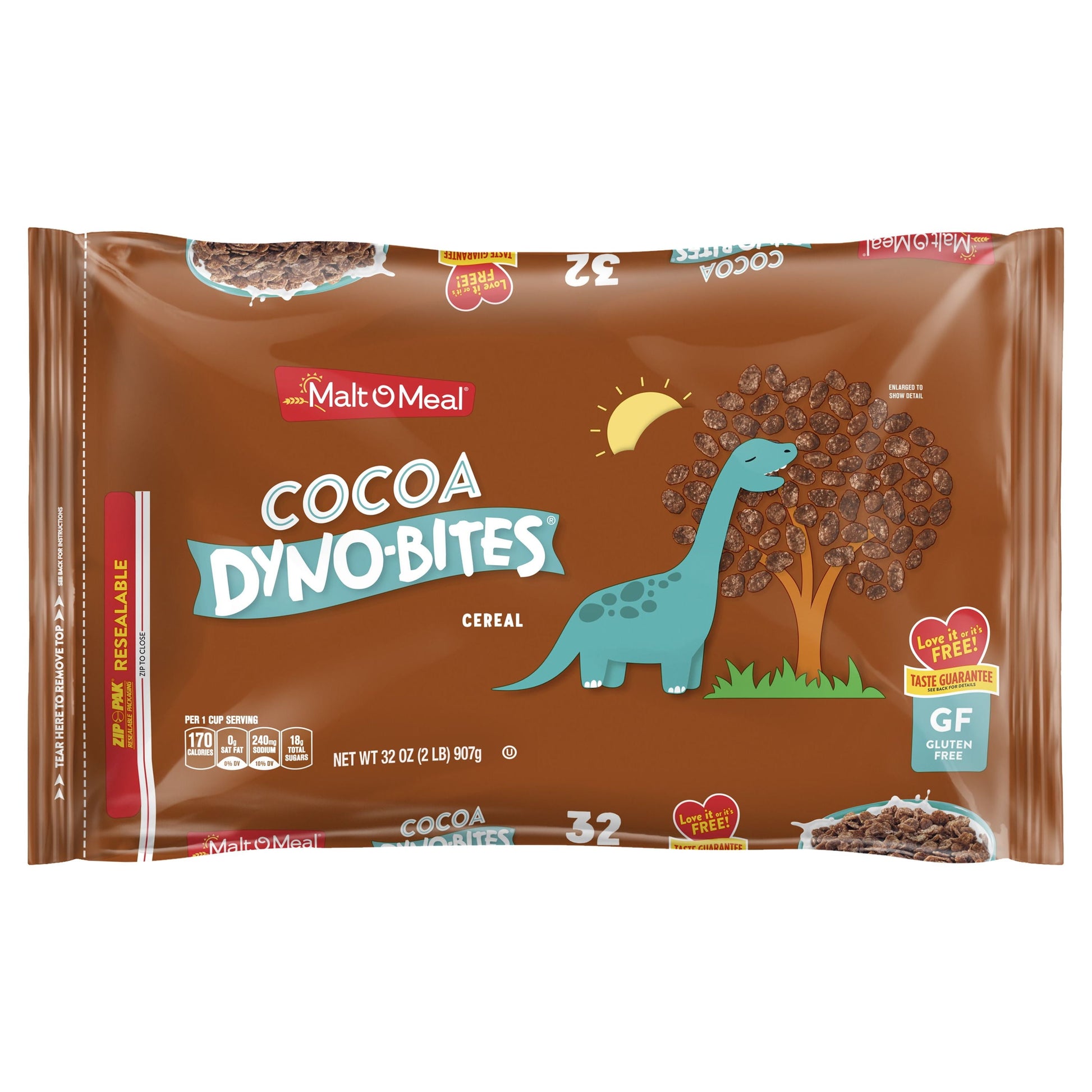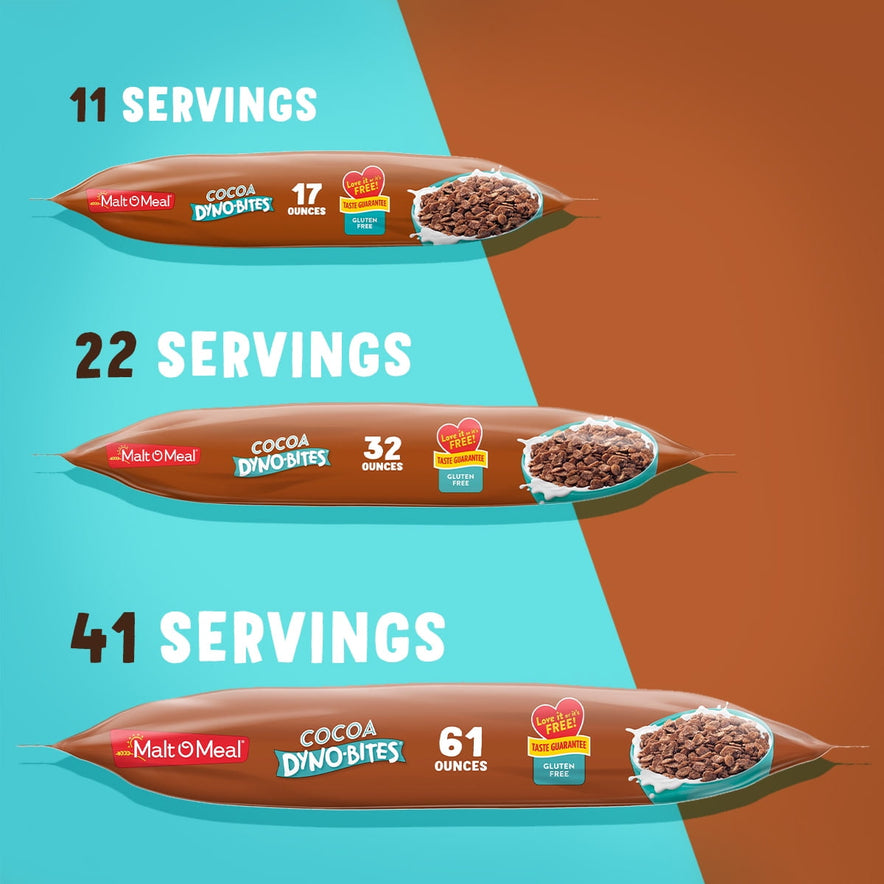 Malt O Meal Cocoa Dyno Bites Gluten Free Cereal is a chocolate lover's dream. This Malt O Meal Cereal is full of sweet little crispy rice puffs made with real cocoa. Fill your cereal bowl with these cocoa rice puff cereal pieces for a breakfast treat that's full of chocolatey goodness. It's gluten free to fit your dietary preferences. This family size cereal bag ensures the whole family can pour a bowl and start the day with excitement. Plus, a bigger bag of cereal means fewer trips to the store for even more cost savings. Enjoy this bagged cereal by the handful or as a simple after school snack when you want a little something sweet. This Cocoa Dyno-Bites cereal comes in a resealable bag so your cereal always tastes fresh and crunchy, never stale. Every bag of ready-to-eat Malt O Meal cereal is backed by Malt-O-Meal's Taste Guarantee, meaning if you don’t love the breakfast cereal for any reason, it’s free (1). (1) With proof of actual retail purchase, the date code from the package, and the reason for dissatisfaction, we’ll offer you one reimbursement per variety per person/per household. Stock up on deliciousness and value with shelf-stable Malt O Meal cereal bags.