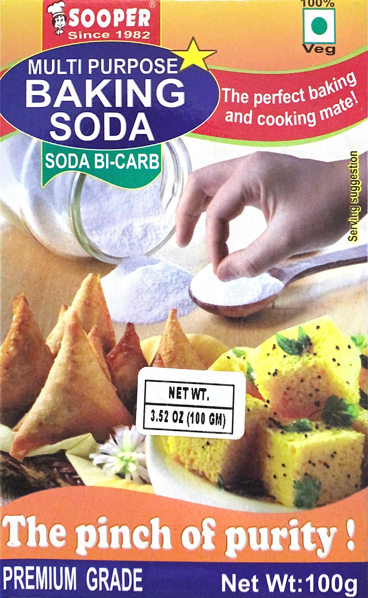 Sooper Multi Purpose Baking Soda 100g white crystalline compound, NaHCO3, with a slightly alkaline taste, used in making effervescent salts and beverages. Also called bicarbonate of soda, sodium bicarbonate.