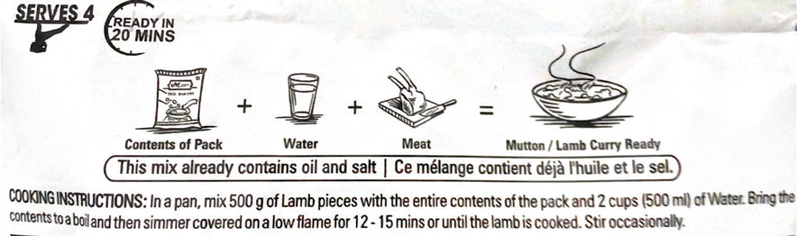 How to make- Take 500g Mutton (lamb) pieces, the entire contents of mutton curry mix & 500 ml of water in a pan. Mix and bring the contents to a boil, then cover the vessel and simmer on low flame for 15-20 minutes till the chicken is cooked. Stir occasionally