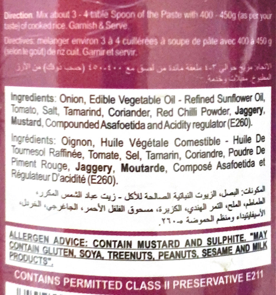 Onion, edible vegetable oil, tomato, salt, tamarind, cilantro, red chili powder, jaggery, mustard, asafoetida, acidity regulator E-260, preservative E-211.