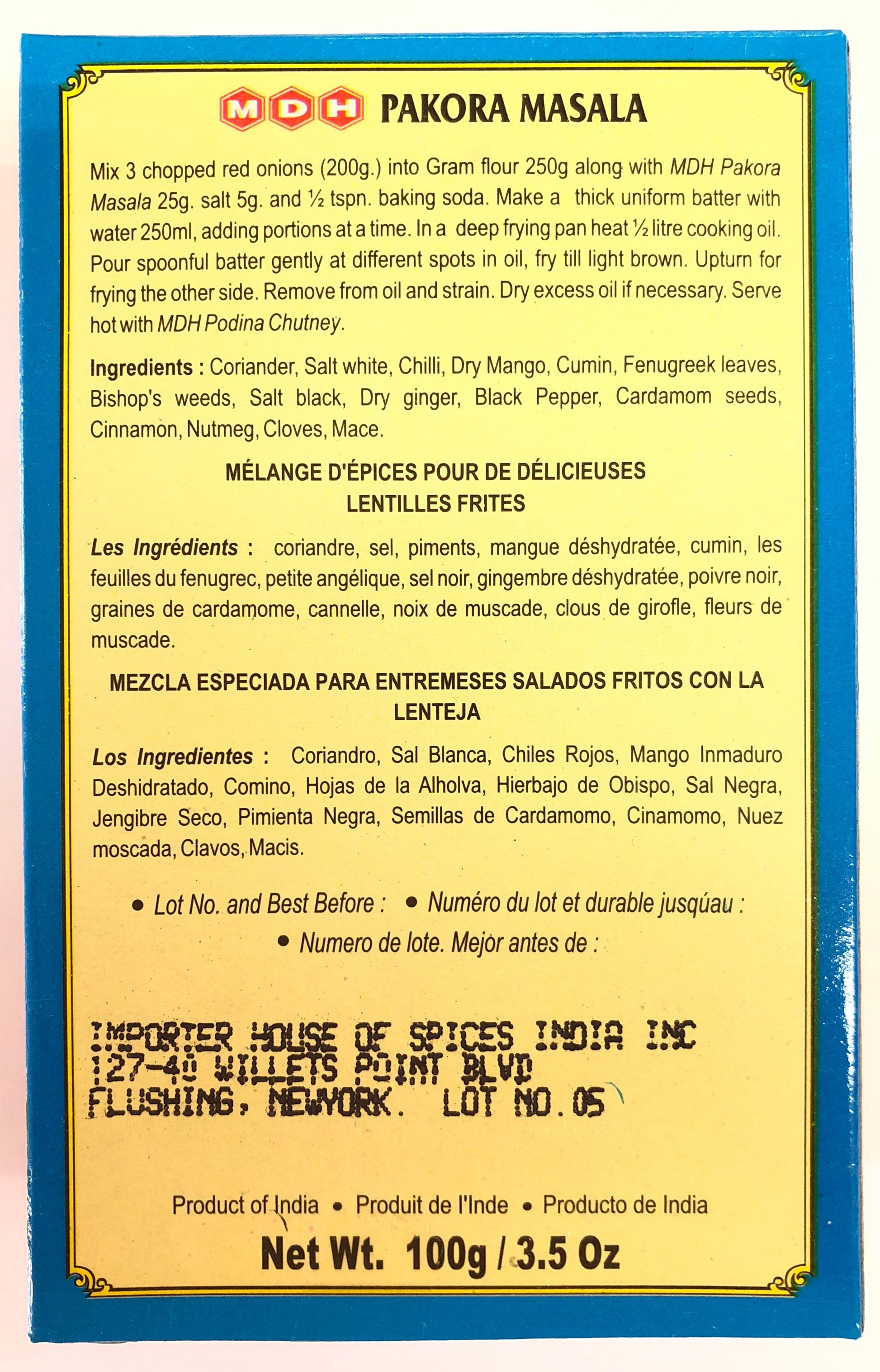 Make a batter with 3 chopped red onions (200g), gram flour (250g), MDH Pakora Masala (25g), salt (5g), baking soda (1/2 tsp) and water (250ml). Heat 0.5 litres cooking oil in a deep frying pan, then gently fry spoonfuls of the batter until golden brown on both sides. Remove from the oil and drain well, blotting any excess oil.