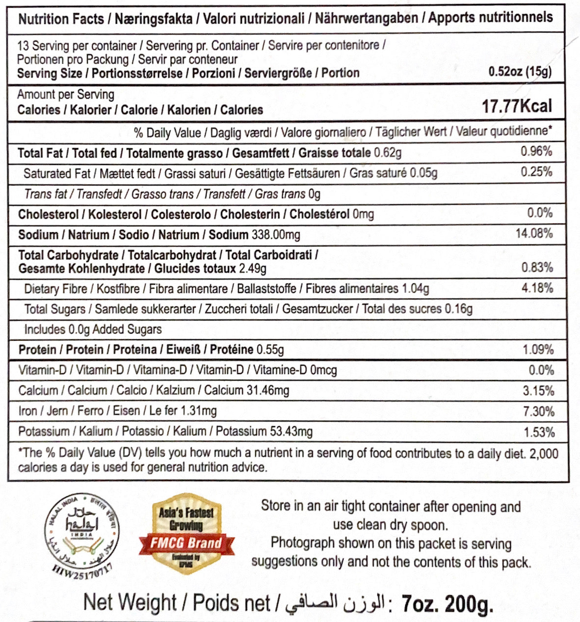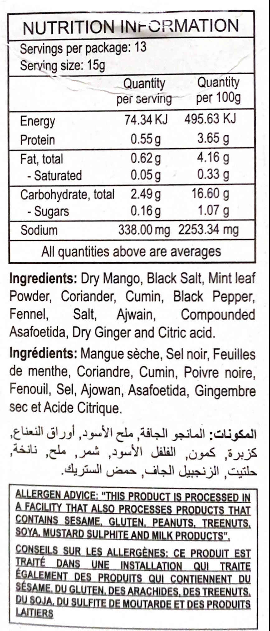 Dry mango, Black salt, Mint leaf powder, Coriander powder, Cumin powder, Black pepper, Fennel seed powder, Salt, Bishop’s weed, Asafoetida, Dry ginger, Citric acid.