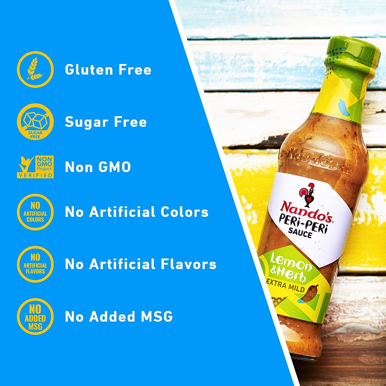 No artificial flavors. Gluten free. Vegetarian. Non GMO Project verified. nongmoproject.org. Peri-Peri Ometer: Extra mild. No artificial colors. No looking back. Our Peri-Peri sauce is made with African bird's eye chilli and a blend of ingredients - onion, sun-ripened lemons, garlic and spices. This one is extra zesty, with a touch of parsley. Peri-Peri is the heart & soul of Nando's and the secret ingredient behind our restaurants worldwide. Condiment. Ingredient. Marinade. Shared with love. nandosperiperi.com/sauces. Recipes and Ideas: nandosperiperi.com/sauces. Born in South Africa. Made in the Netherlands.