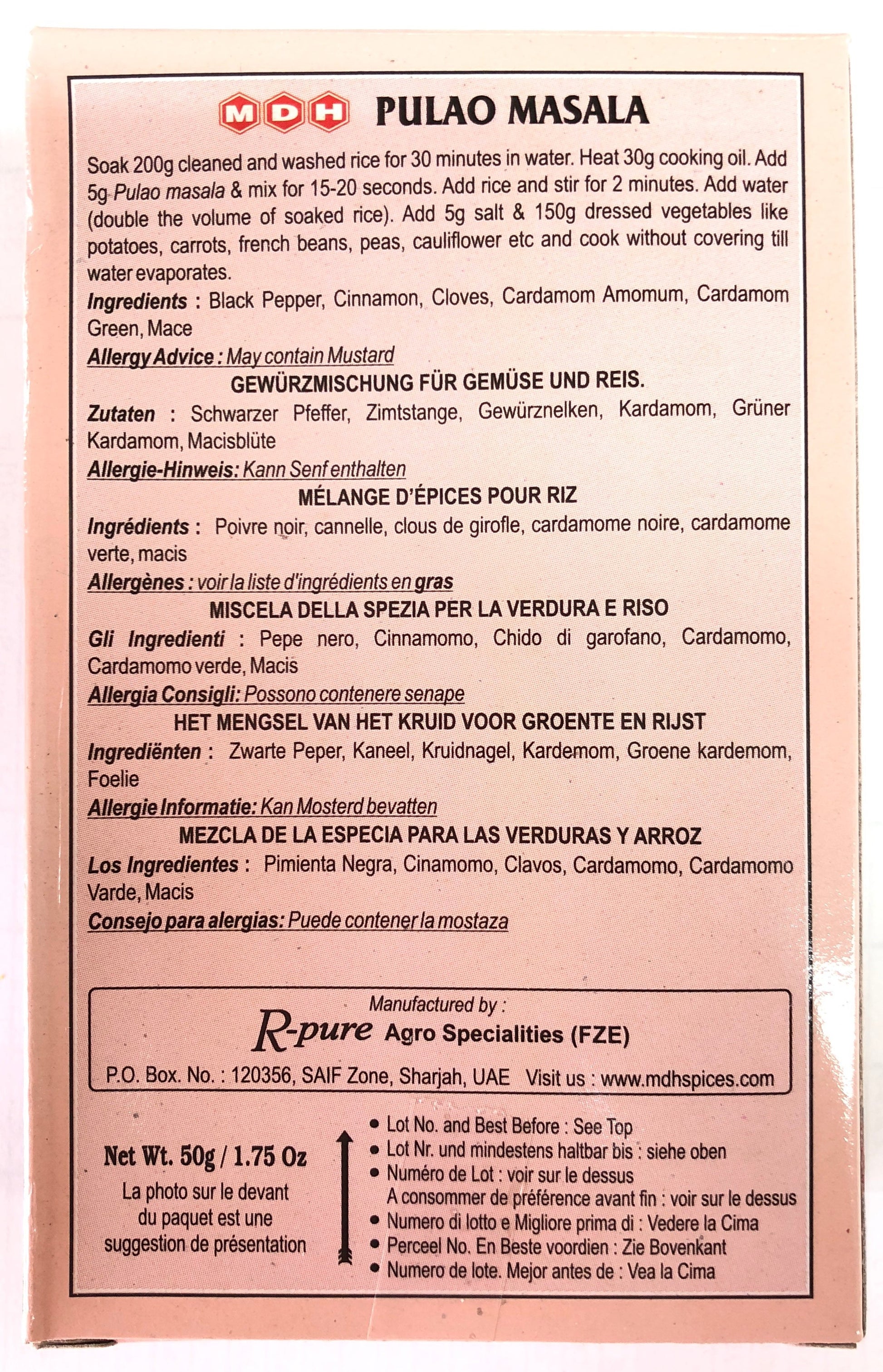 MDH Pulao Masala 50 g. Also called Pullao or Biryani Masala. A spice blend for making a lightly spiced vegetable rice dish. Ingredients : Cassia, Black Pepper, Cardamom seeds, Cloves, Caraway, Cardamom green, Mace.
