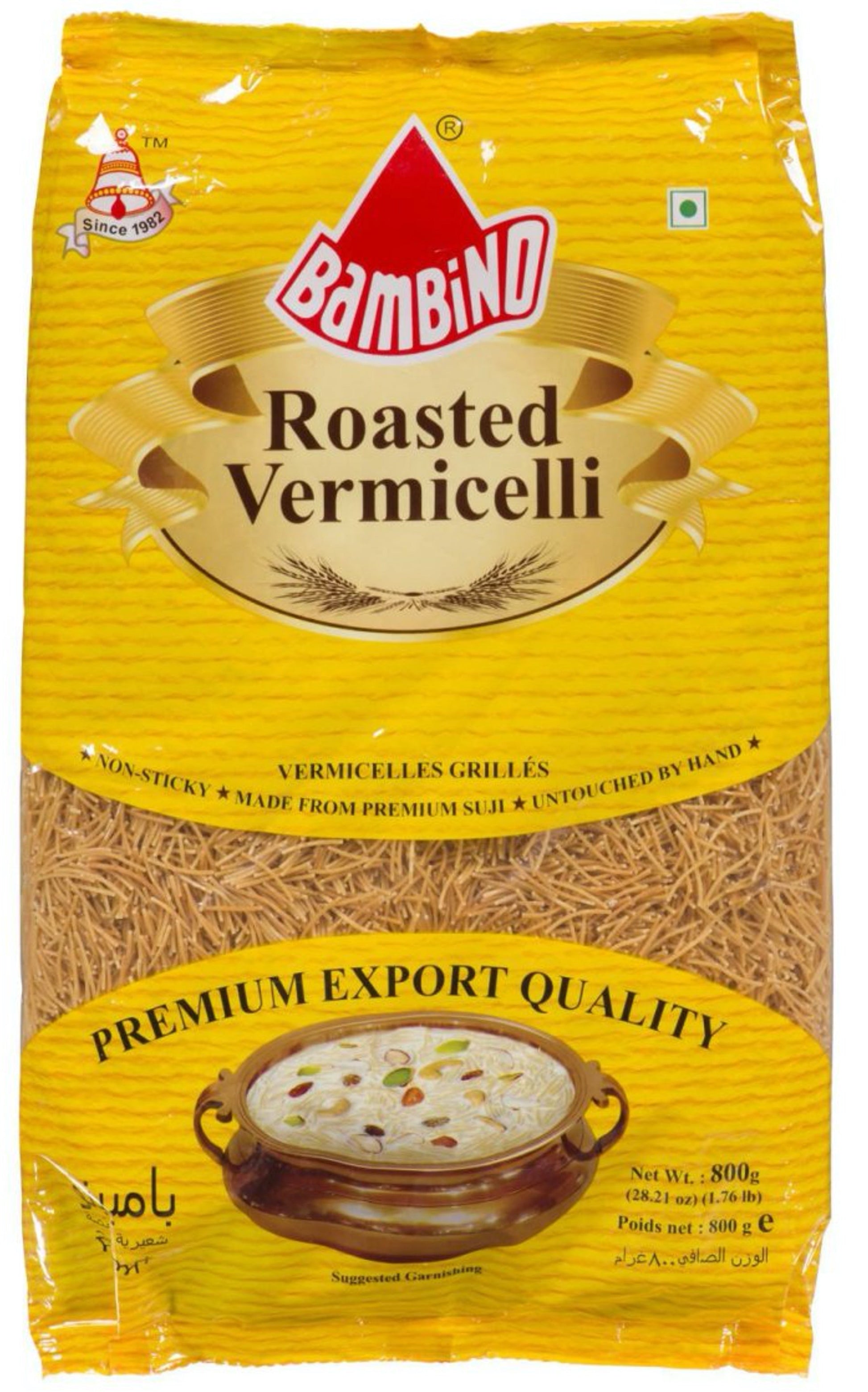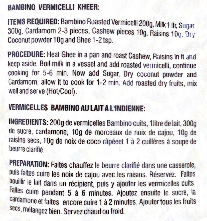 Bambino Vermicelli is made by a special process that ensures it is non-sticky and doesn't form clumps. You can use Bambino Roasted Vermicelli in so many ways! Make creamy, sweet kheer, savory upma, or toss it with boiled vegetables for a whole.