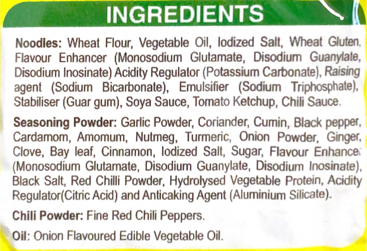 Wheat Flour, Iodised Salt, Chilli, Vegetable Oil, Tomato Ketchup, Chilli Sauce, Soya Sauce, Spices, Monosodium Glutamate, Edible gum and permitted food additives.