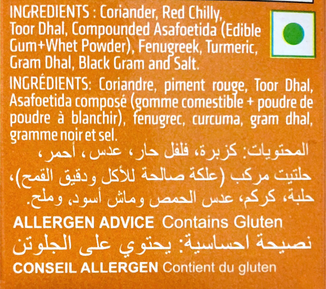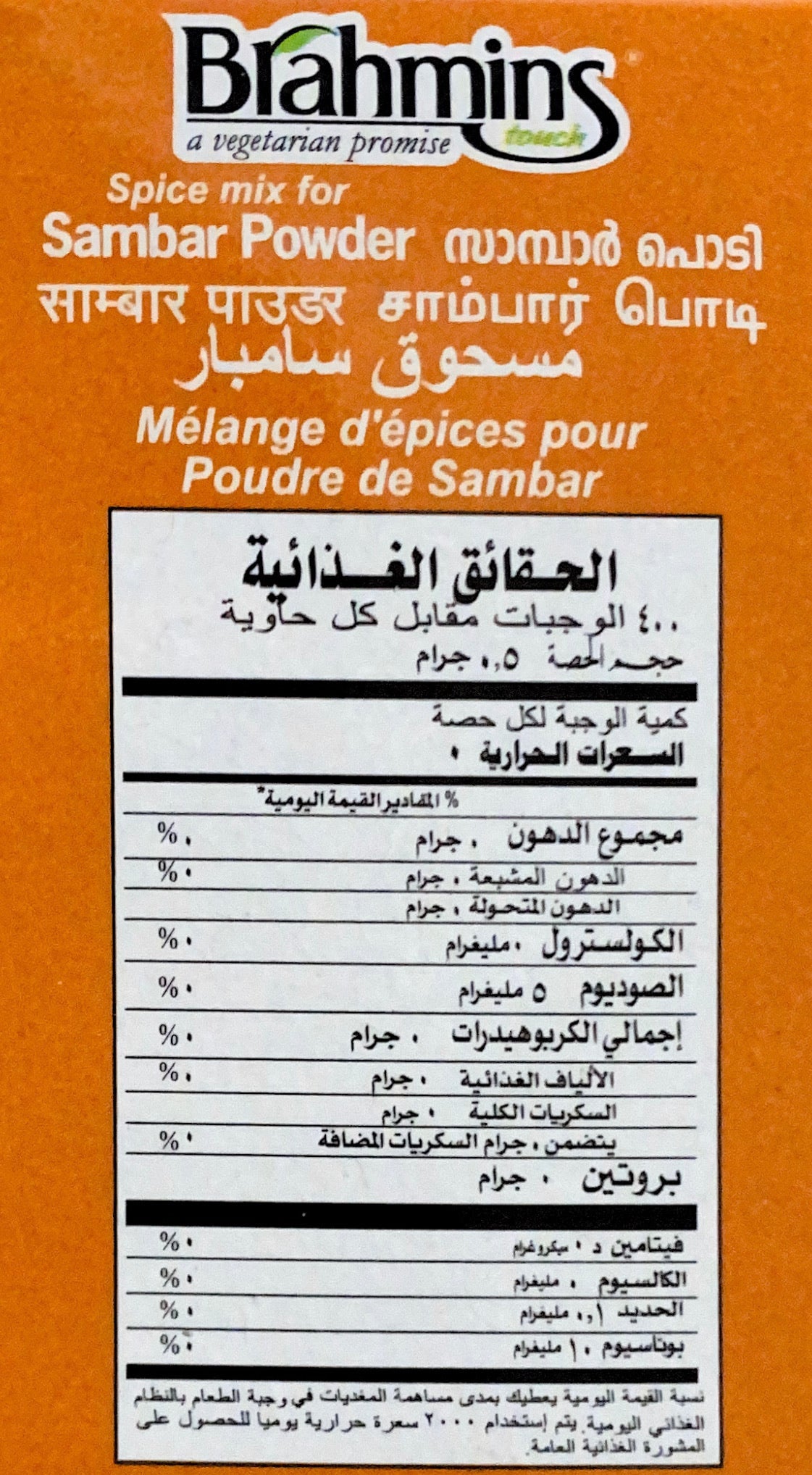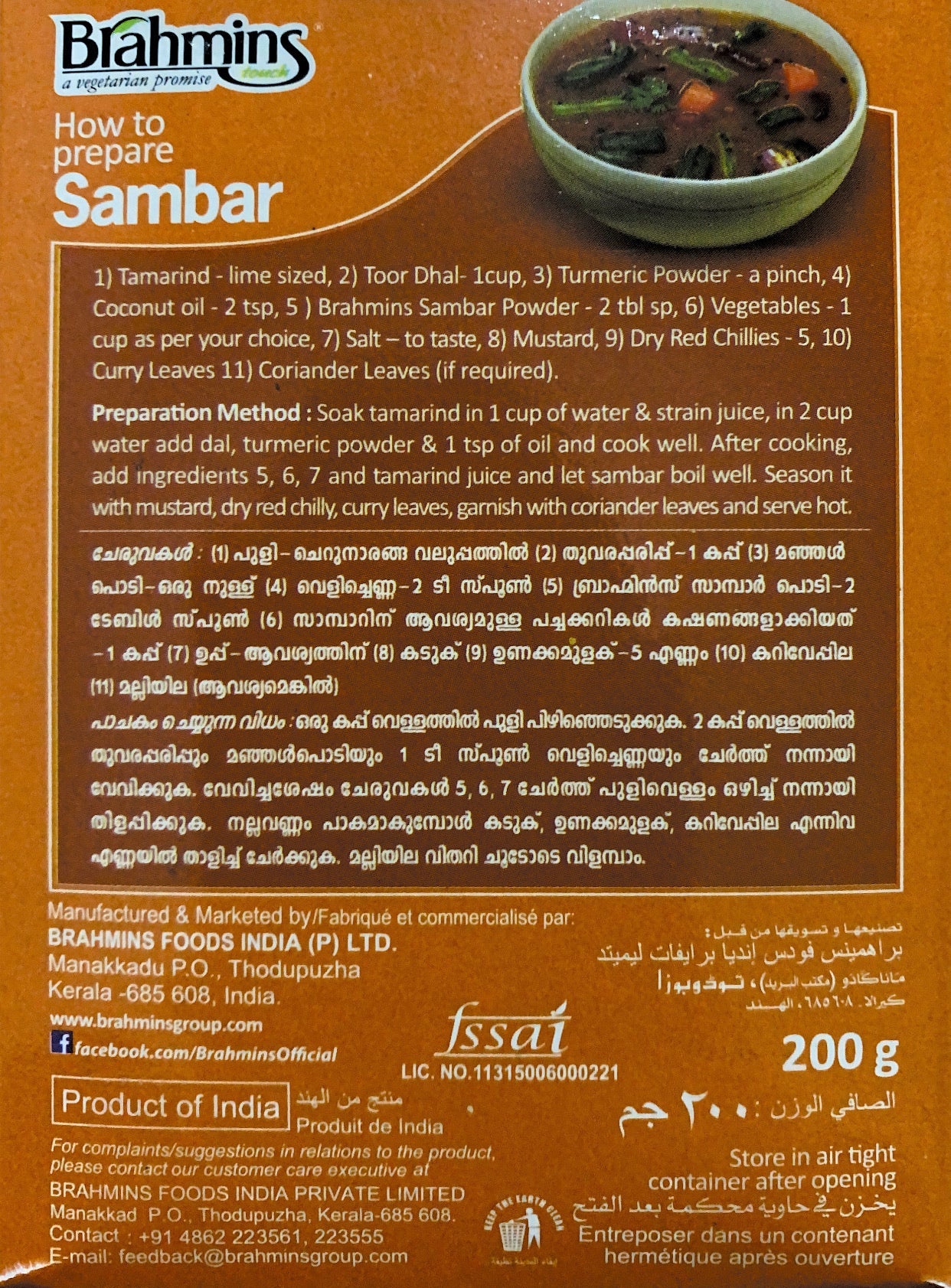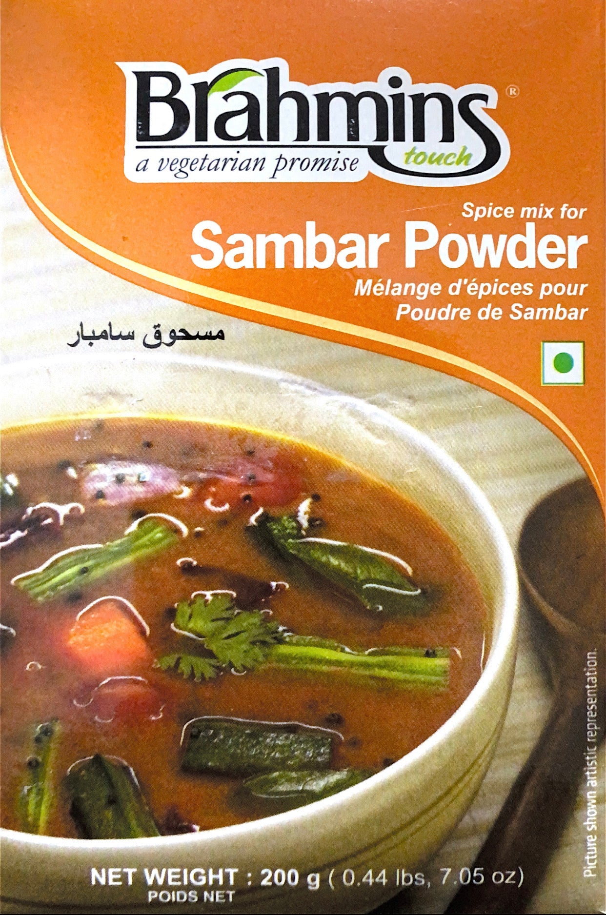 Sambar Powder - Madras style with no onion or garlic from renown spice manufacturer. Ingredients: coriander, chilli, pepper, cumin, lentil, fenugreek, compounded asafoetida, turmeric, salt and curry leaves. Recipe: Soak 160g of dhal in 250ml of water and pressure cook for 10 minutes for upto 3 whistles. Keep it aside. Heat oil in a kadai, add mustard seeds, onions, curry leaves and green chillies. Add drumstick, cook for sometime and then add tomatoes and brinjal. Add Aachi Sambar powder, coriander leaves, 750ml of water. Cook with closed lid for 10 minutes. Add tamarind juice followed by dhal and coriander leaves. Finally add salt. Sambar is ready-to-serve.