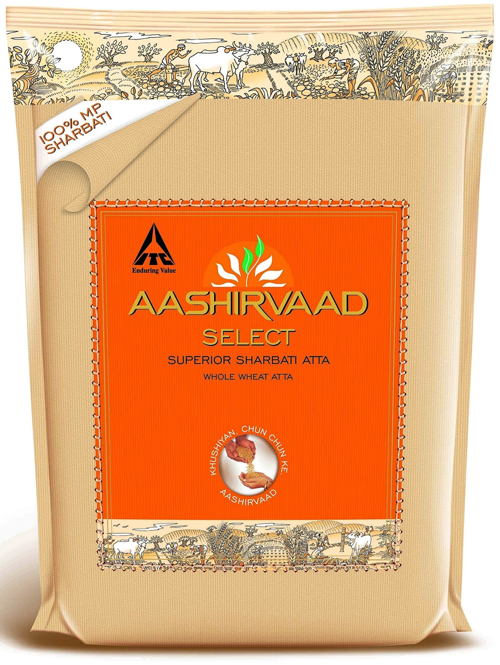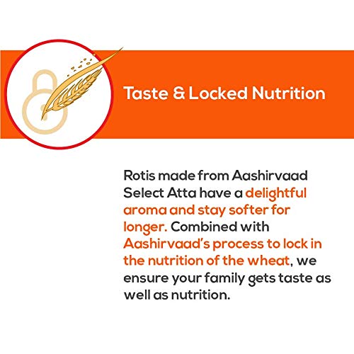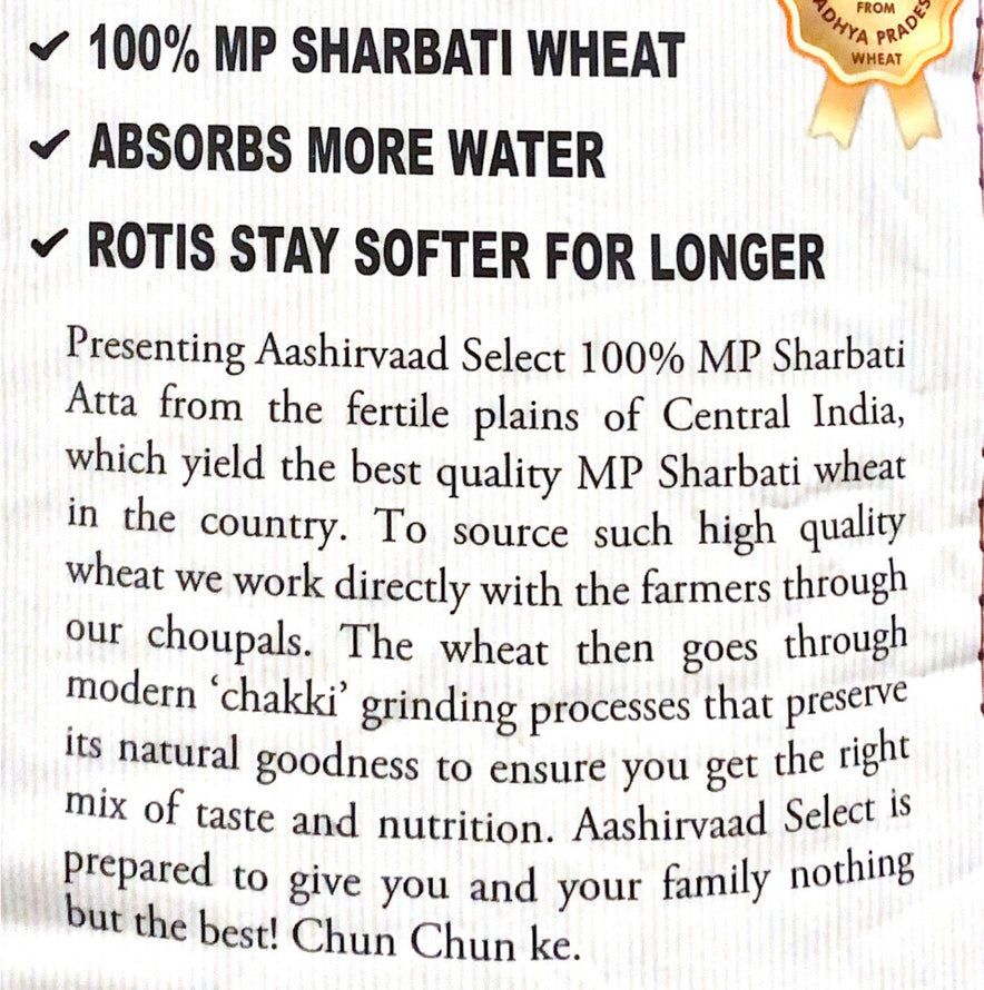 Aashirvaad Select is a premium quality atta made from the king of wheat. It is 100% Sharbati MP wheat that is harvested in the Sehore region of Madhya Pradesh. Here, the golden fields are sun-kissed to perfection and bathed in just the right amount of rain. That is why each grain has a golden sheen and is heavier. Our experts hand-select Sharbati wheat grains that are consistent in size and blessed with a golden sheen, which makes AASHIRD Select Atta truly Select. This is why rotis made from Aashirvaad Select Atta has a delicious aroma and stays smoother for longer. Combined with AASHIRVAAD's process to lock in wheat nutrition, we make sure your family gets flavor and nutrition.