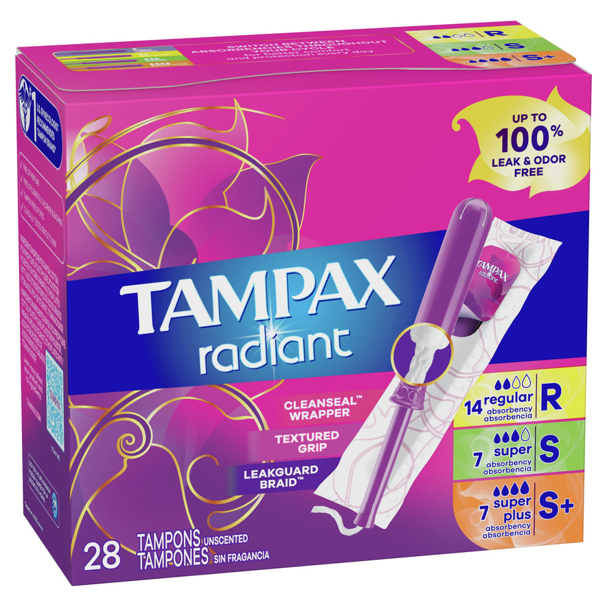 It's a new time for that time of the month. Get up to 100% leak and odor-free protection with Tampax Radiant tampons designed with a LeakGuard Braid to help stop leaks before they even happen. For protection you can feel good about. Free of dyes, perfume, latex*, BPA, and elemental chlorine bleaching. Thanks to their Textured Grip, they are specifically designed for incredibly comfortable tampon insertion. Plus, they come in a CleanSeal Wrapper created for more** ease, more clean, and more hygiene - to help dispose of them wherever you are. Don't settle for less when you can get more. Discover outstanding protection for up to eight hours with Tampax, the #1 U.S. Gynecologist recommended tampon brand*** *natural rubber latex **vs. Tampax Pearl ***based on 2020 survey. Unscented, 28 Ct.